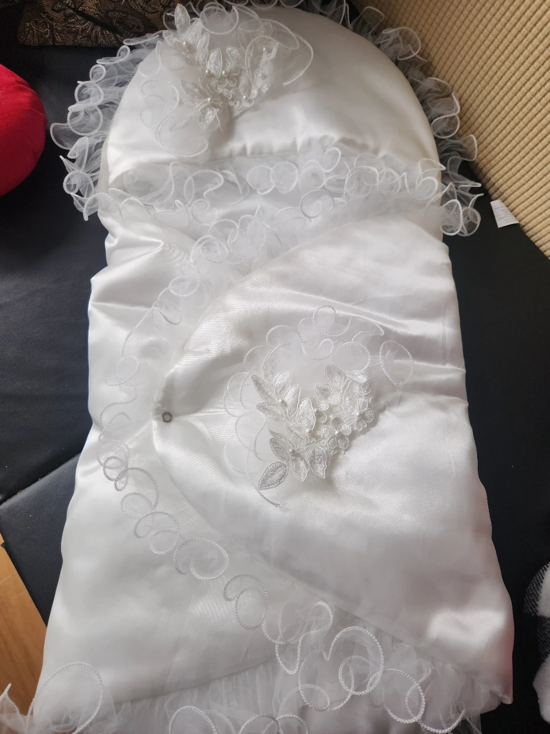 A beautiful white satin christening gown or bunting for a baby. It features delicate lace and bead embellishments with ruffled trim. It's perfect for special occasions.