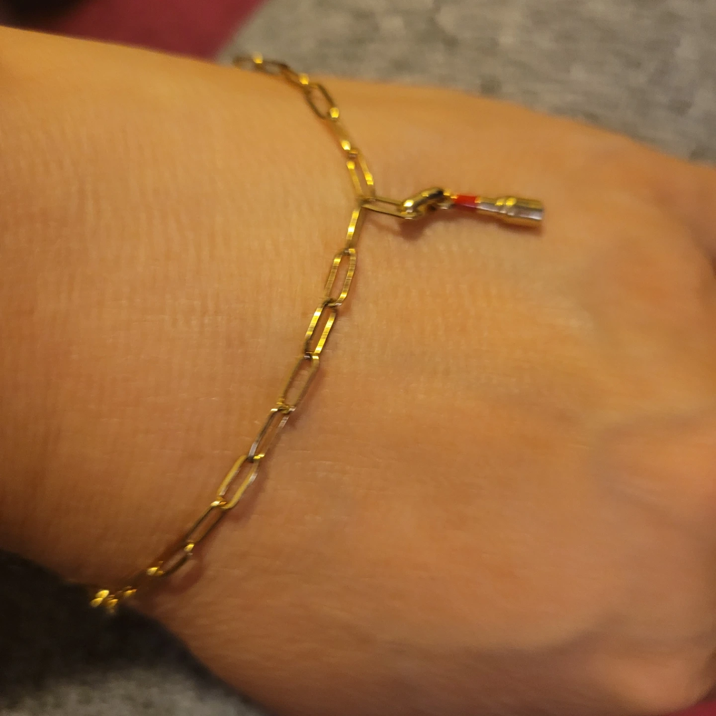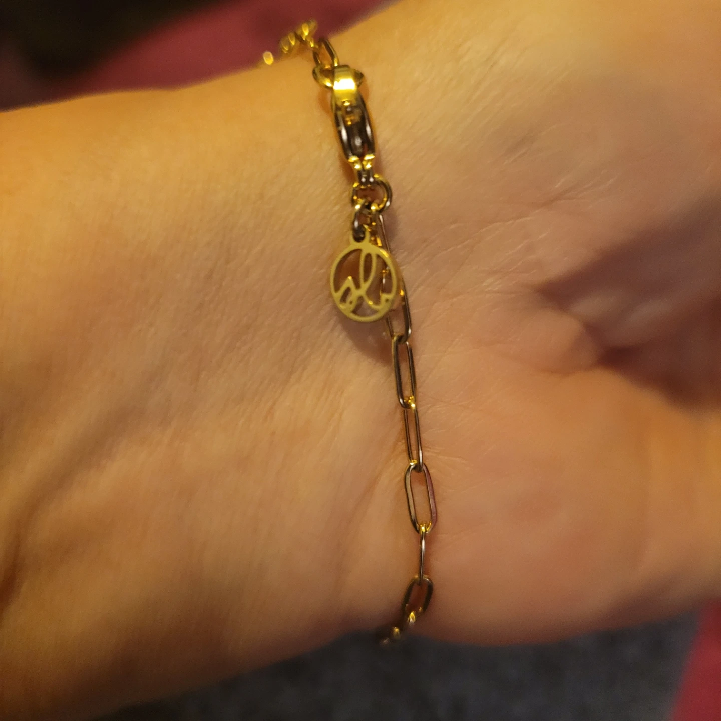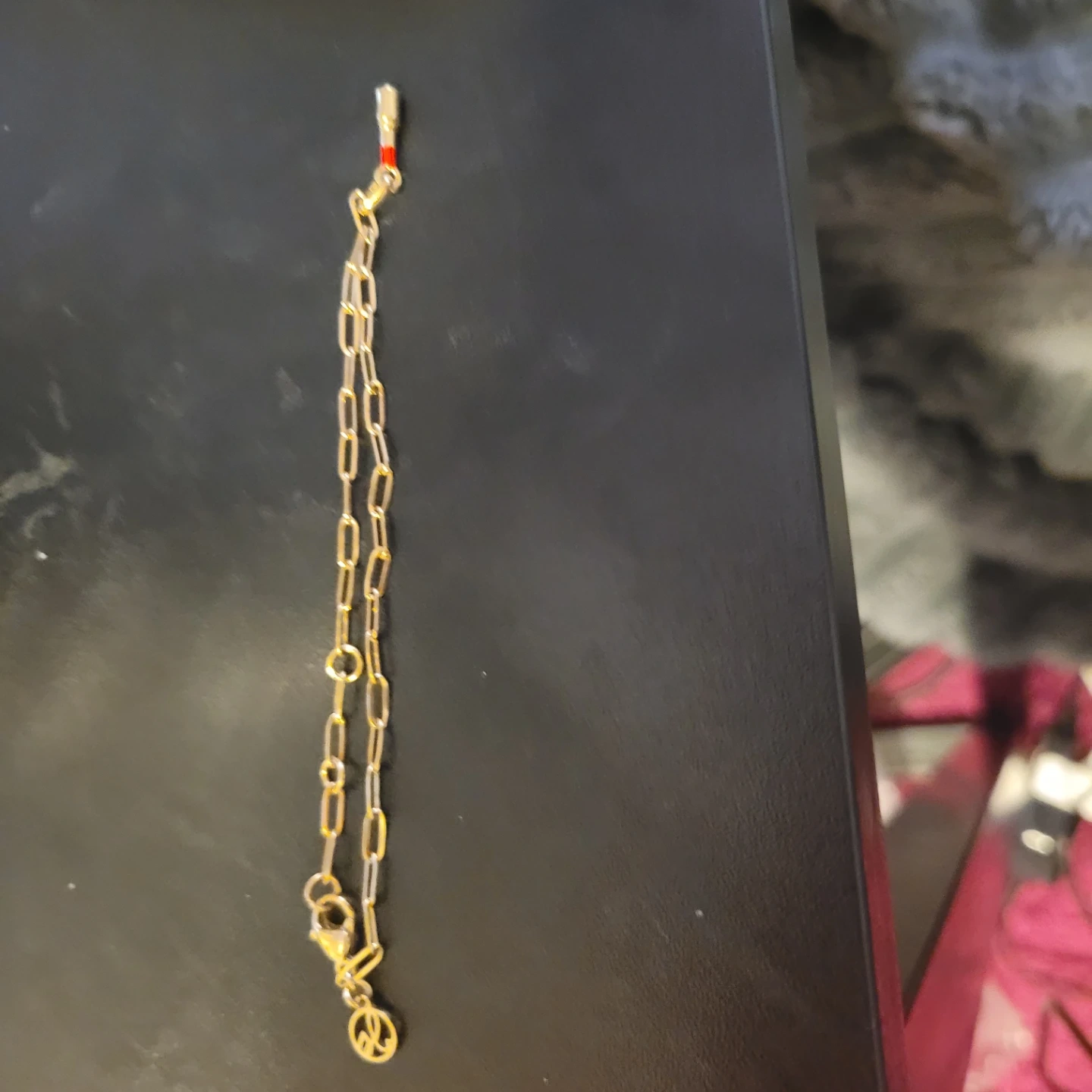 A gold tone bracelet featuring a delicate paperclip chain and a small charm. The bracelet measures approximately 7.5 inches in length and has an adjustable clasp for a comfortable fit. It's a lovely piece for everyday wear!