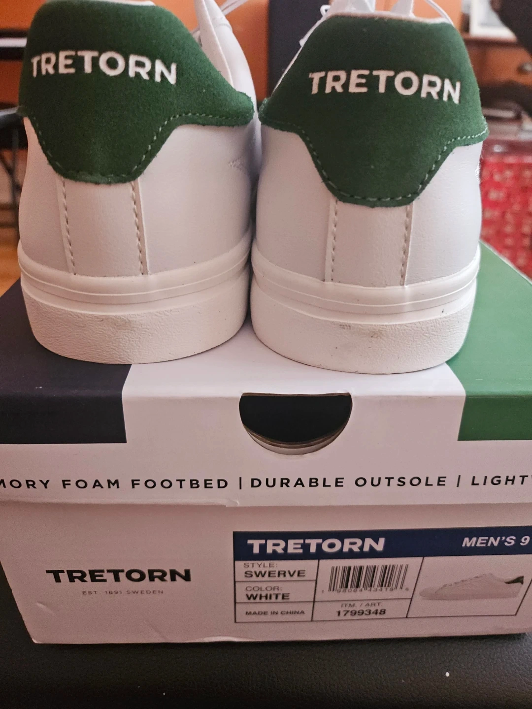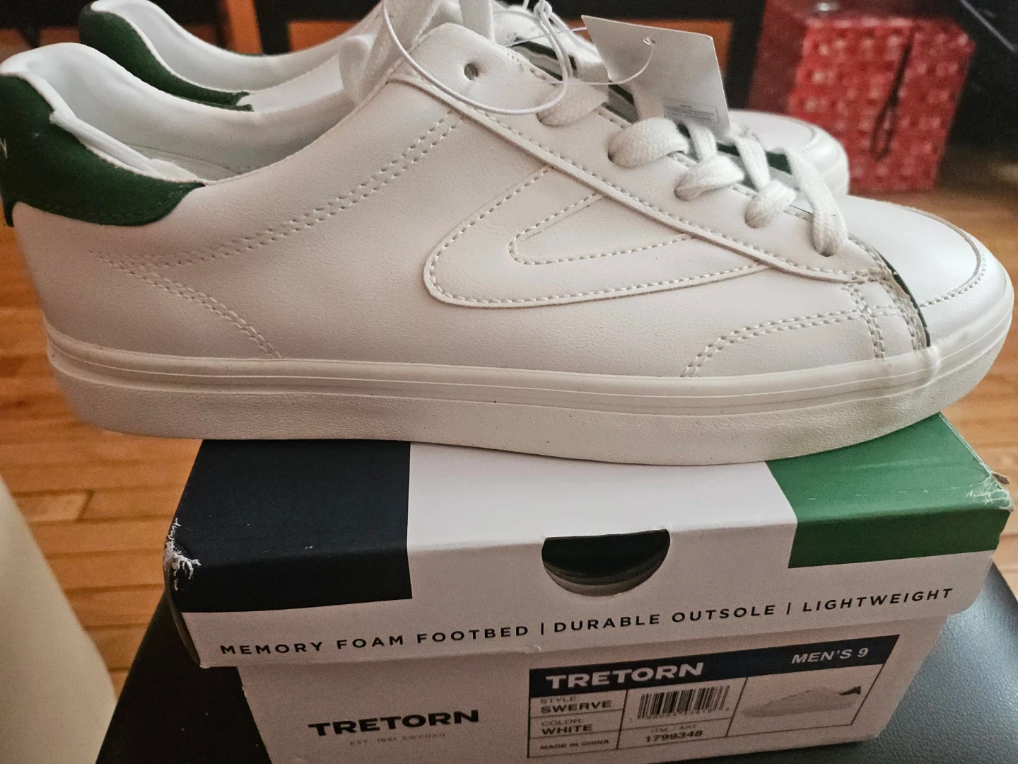 Tretorn Swerve sneakers in white. Men's size 9. Features a durable outsole and memory foam footbed. Comes with original box.