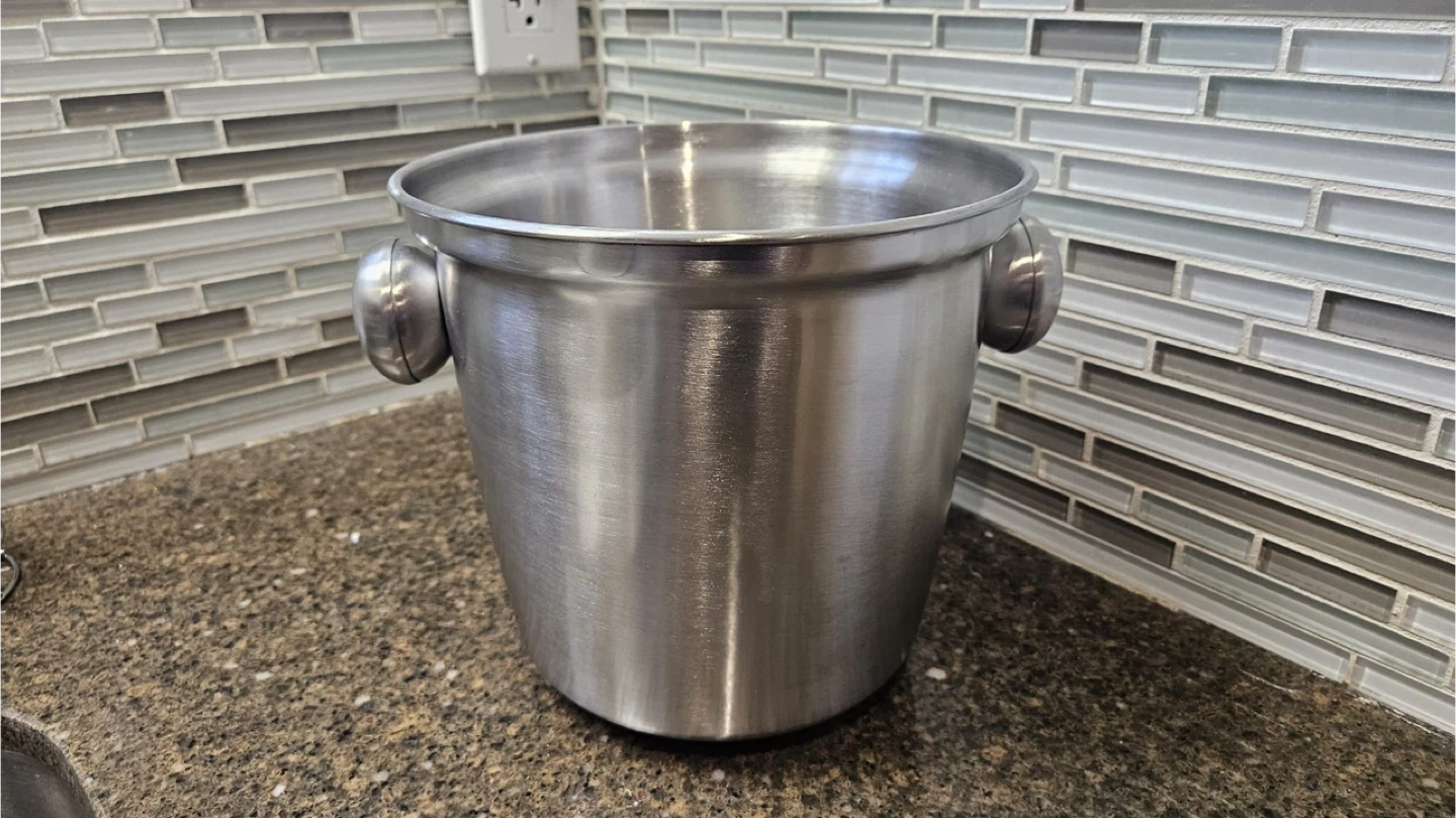 Two stainless steel buckets are included. One is a larger ice bucket with handles, and the other is a smaller metal container. Both are made of brushed stainless steel.