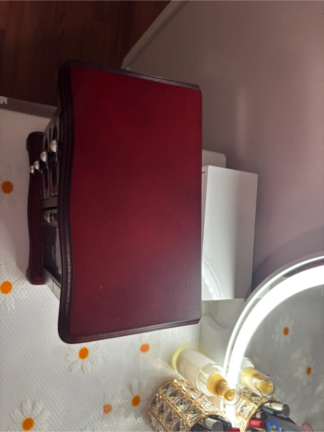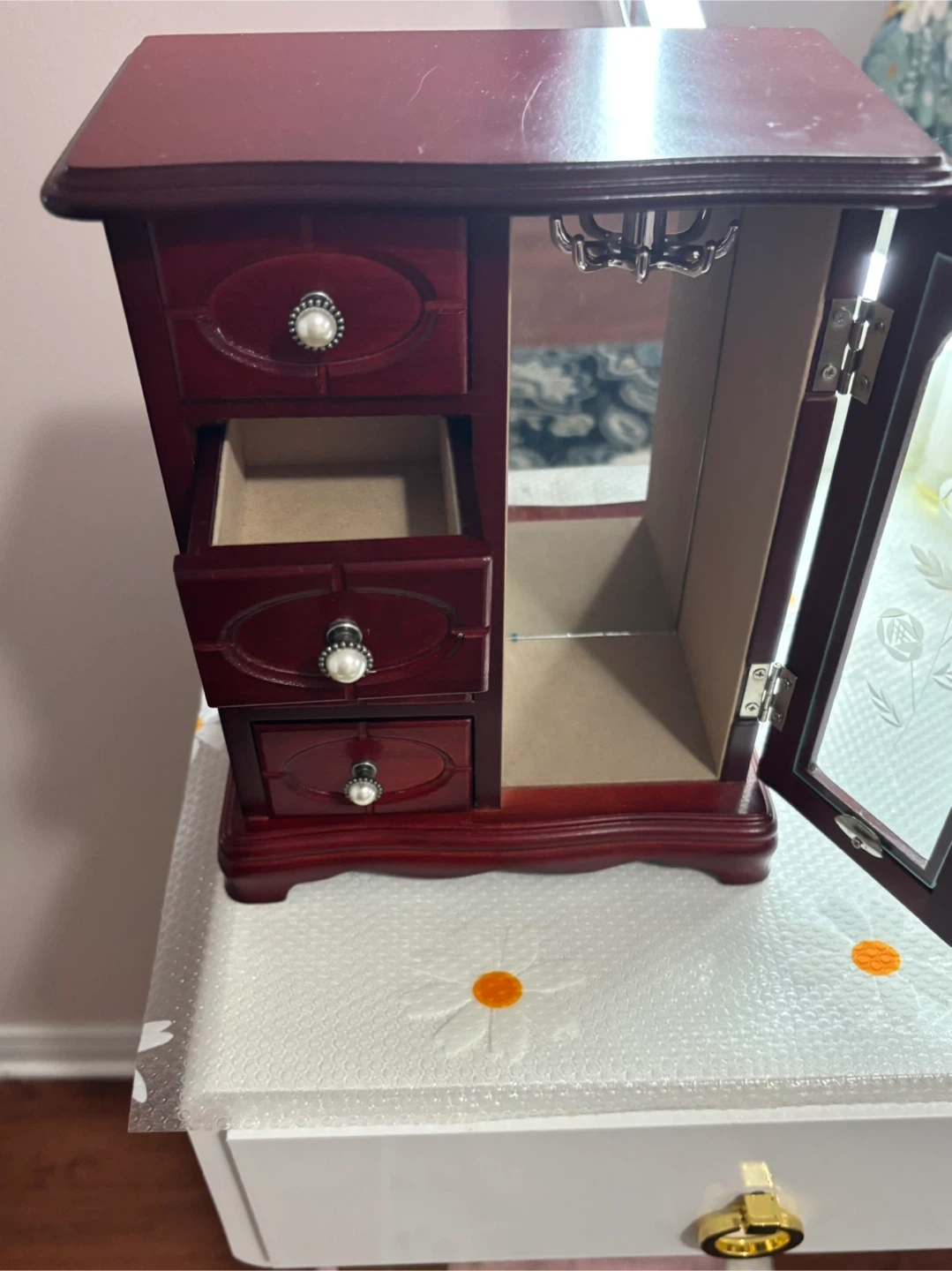 This is a beautiful wooden jewellery box with multiple drawers and a mirrored door. It's perfect for organizing your necklaces, rings, and other accessories. The interior features compartments to keep your items tidy and protected.