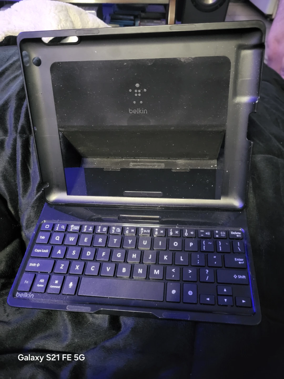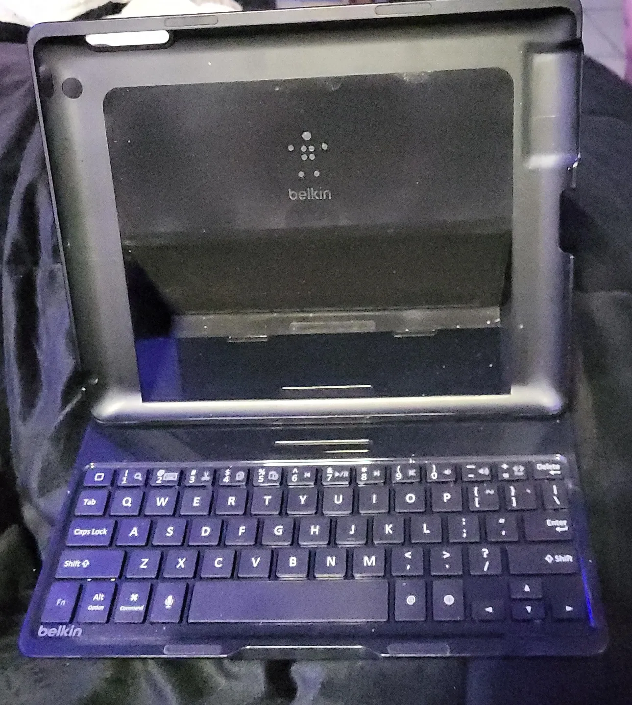 Black Belkin keyboard case for a tablet. It has a built-in keyboard and a protective cover. Some wear and tear visible on the exterior. There is some rips on the leather as u can see in tge pictures still works perfectly .