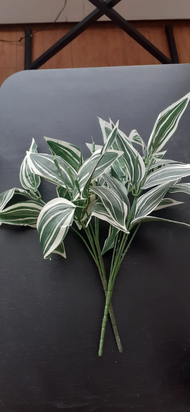 These are artificial plant stems with green and white striped leaves. They're great for decorative arrangements. The stems are wired for shaping. Use them to add a touch of greenery to your home decor!
