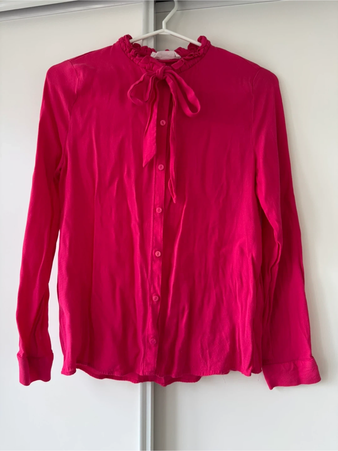 Selling a cute pink long-sleeve blouse! It has a ruffled neckline and a tie detail. Perfect for adding a pop of colour to your wardrobe! Size S from Mango.