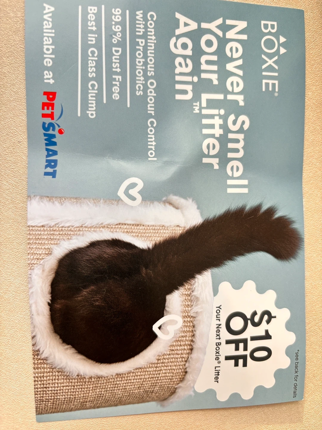 This is a manufacturer's coupon for $10 off any Boxie® Litters. It expires on 12/21/2026. Continuous odour control with probiotics. 99.9% dust free.
