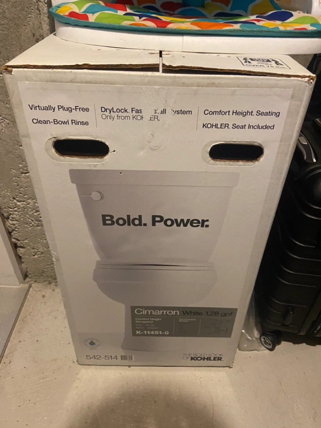 This is a new Kohler Cimarron 2-piece toilet in white. It's a 1.28 gallons per flush model with a chair-height design. Includes the seat.