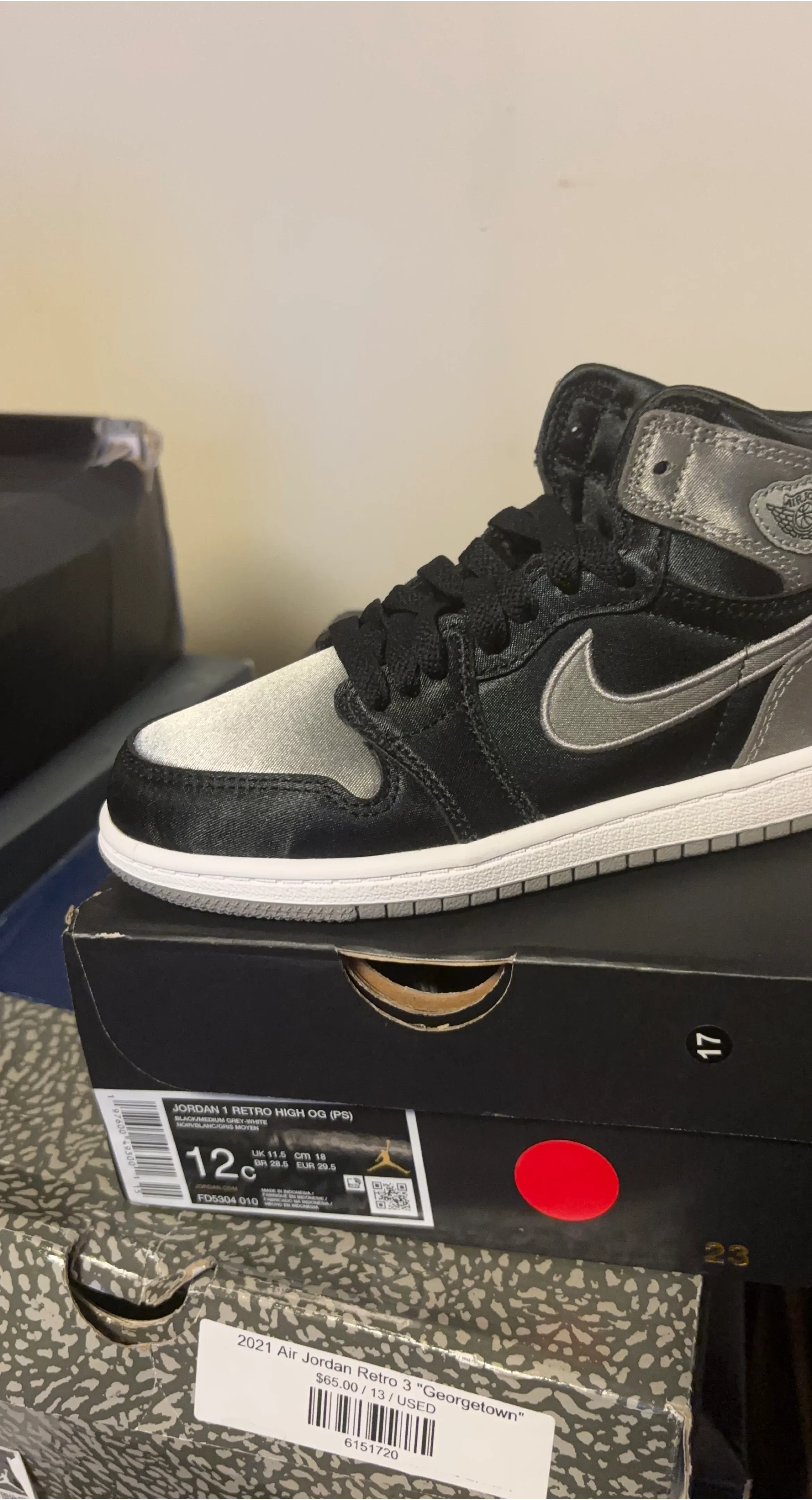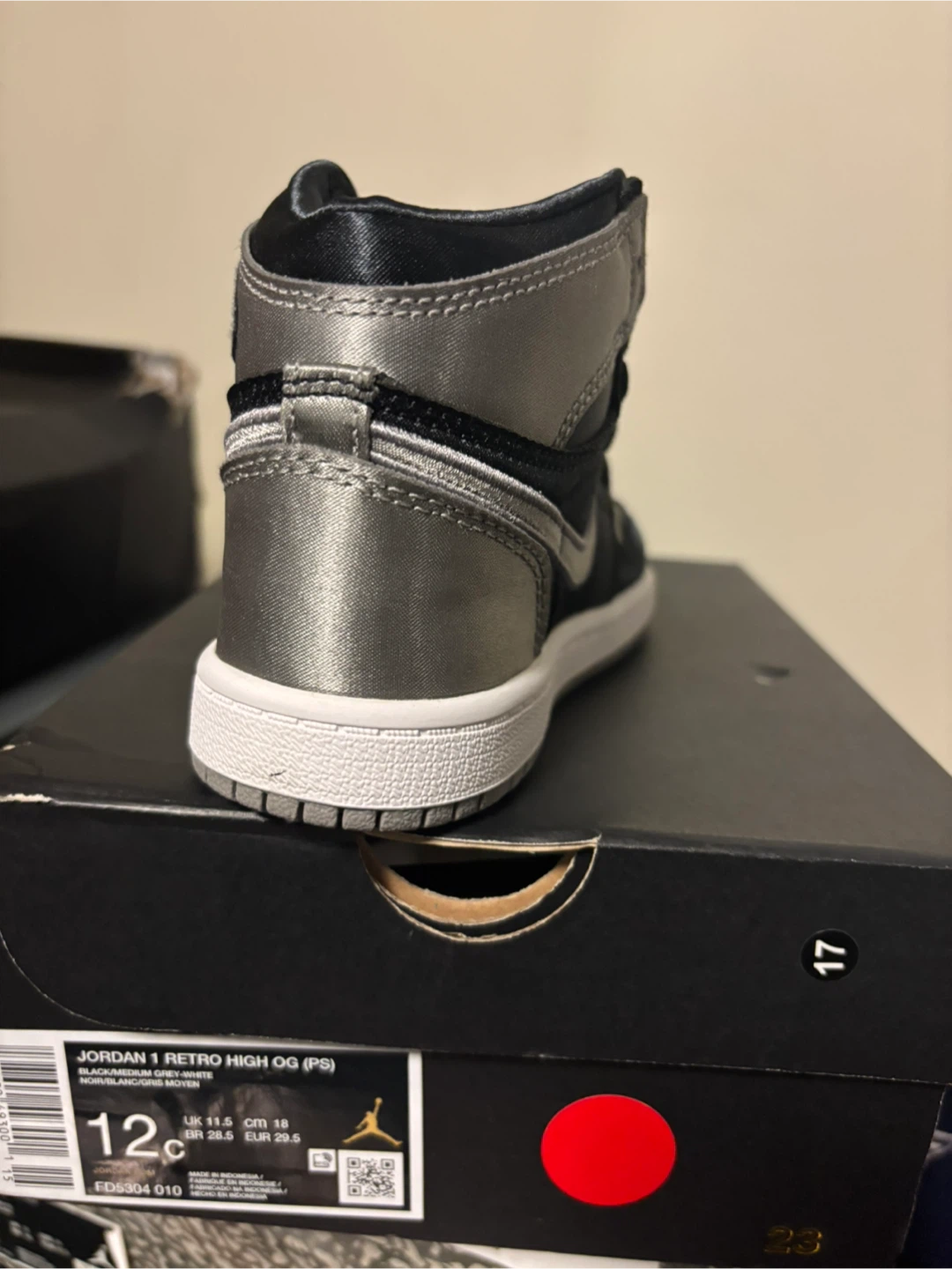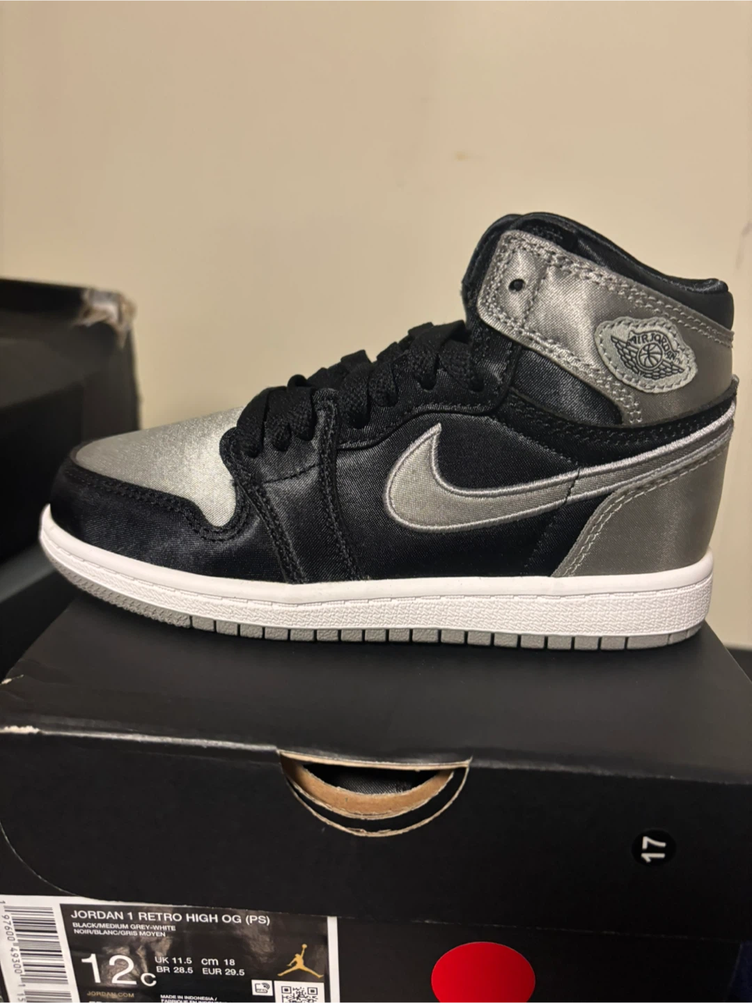 These are Jordan 1 Retro High OG (PS) sneakers in a black and medium grey colorway. They're a kids' size 12c. Includes original box.