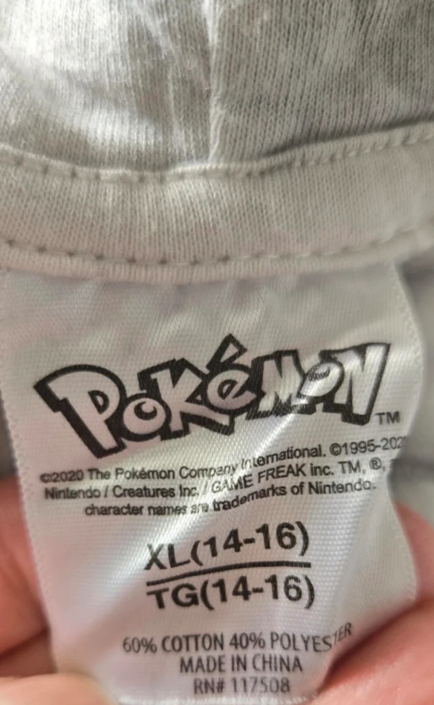 This grey and white tie-dye hoodie features a large Pikachu graphic with "Gotta Catch 'Em All!" text. size XL (14-16).