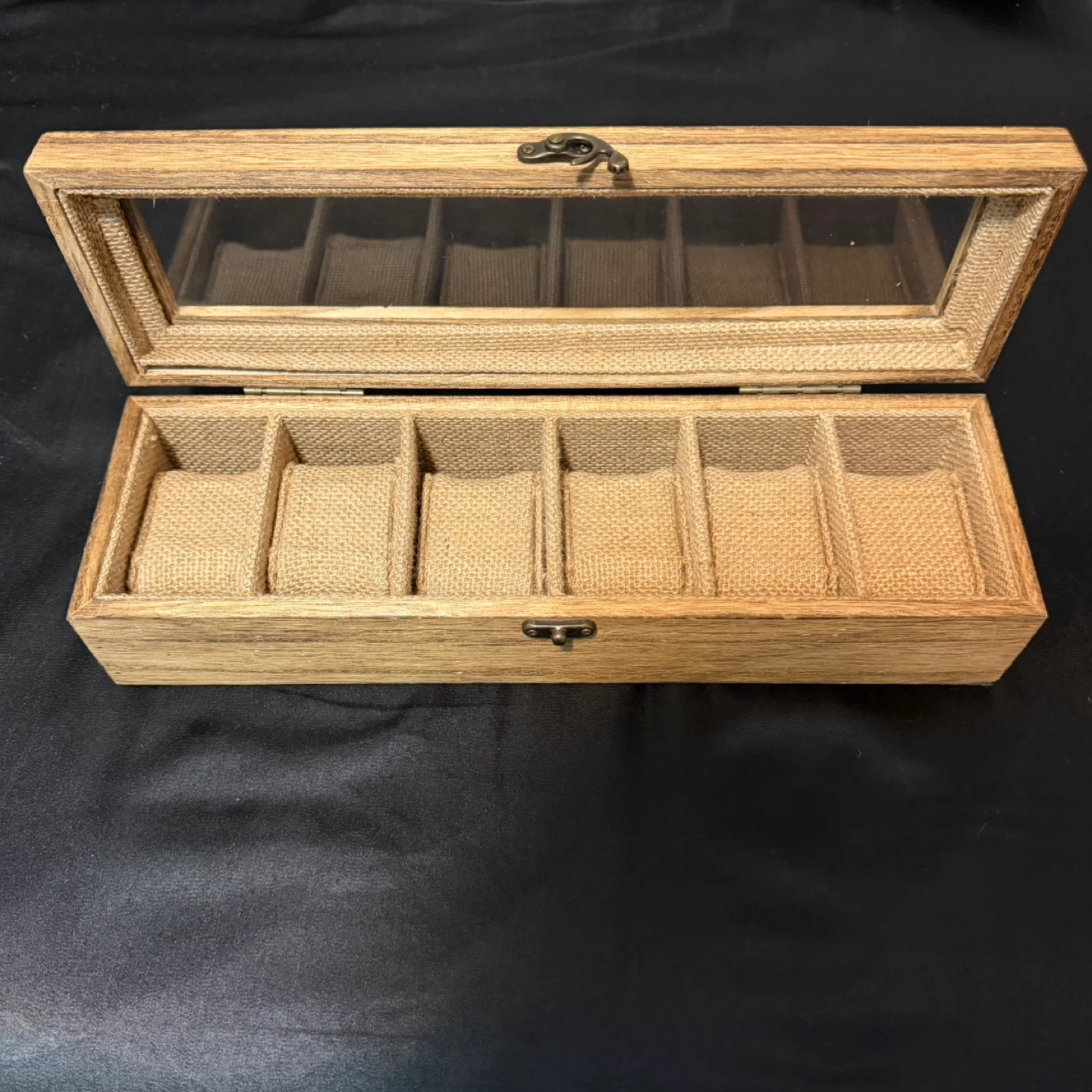 Selling a wooden watch display box with a glass top. It's in great condition and perfect for storing and displaying your watches safely and neatly. It has six slots with burlap cushions to keep your watches secure and scratch-free.