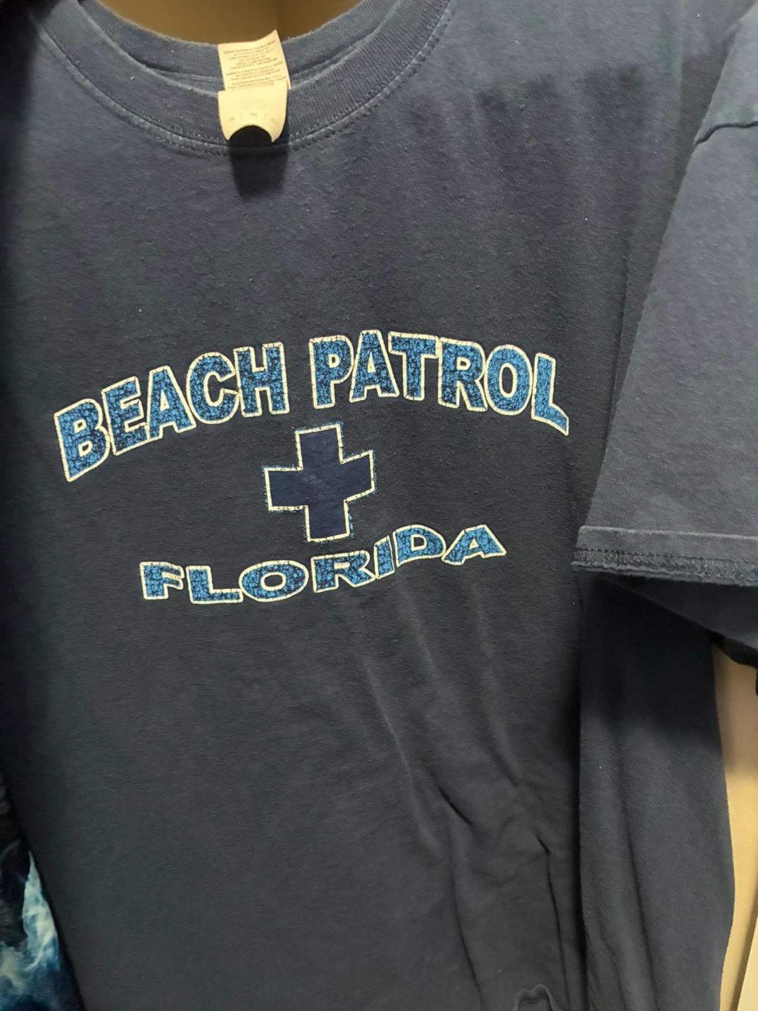 Navy blue t-shirt with "Beach Patrol Florida" graphic on the front. Made of comfortable cotton material. Great for casual wear!