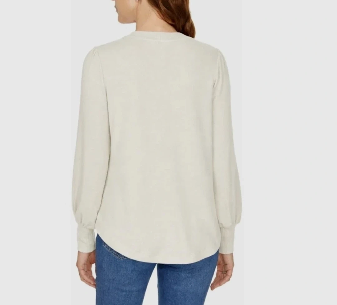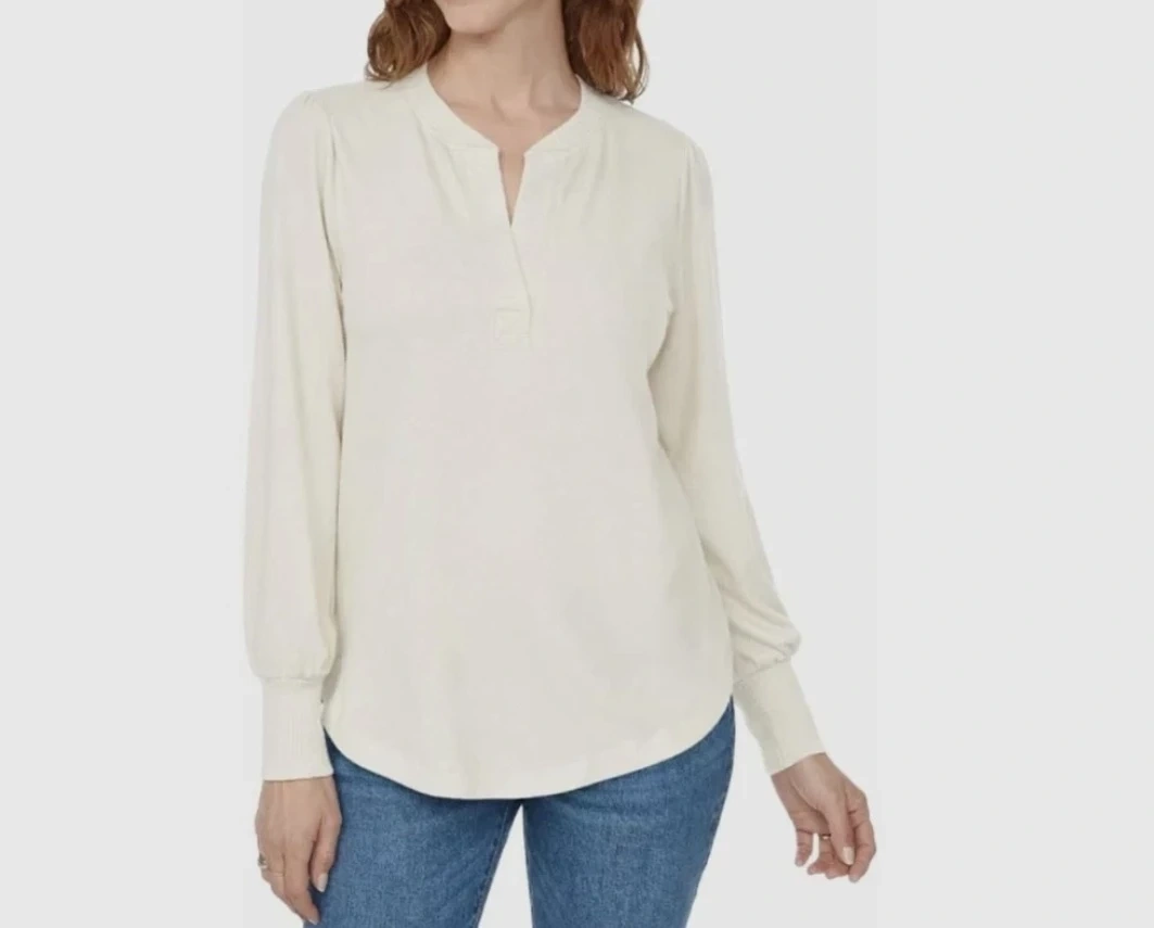 A cream long sleeve top with a split V- neckline. It features a soft hand feel and a relaxed fit. Made from a blend of 79% Viscose, 17% Polyester, and 4% Elastane. This midweight top is perfect for everyday wear!