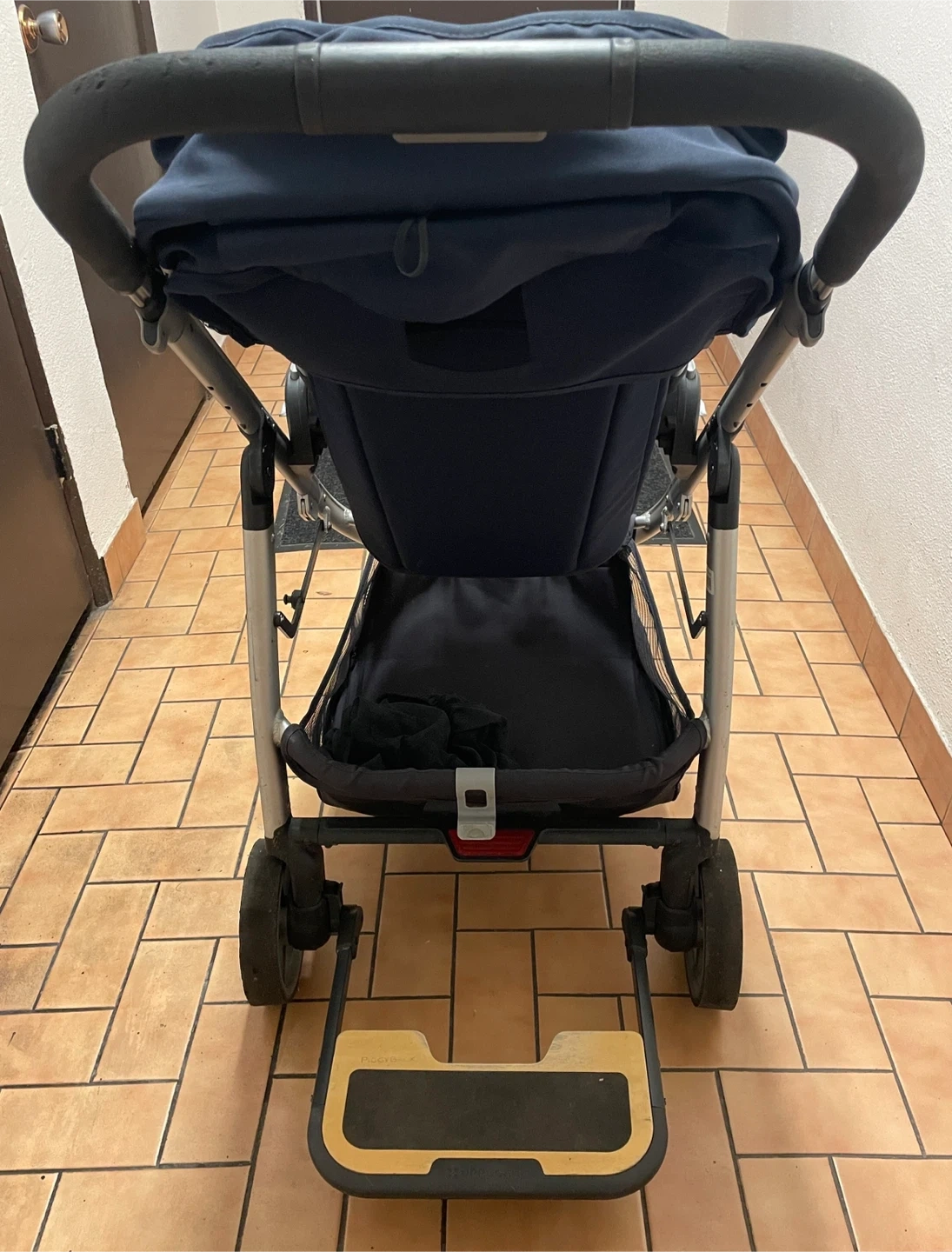 This navy UPPAbaby Cruz stroller is in good condition. It features a large storage basket and a smooth ride. Includes the RumbleSeat piggyback board for a second child!