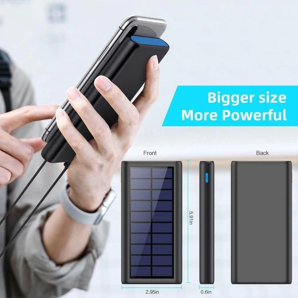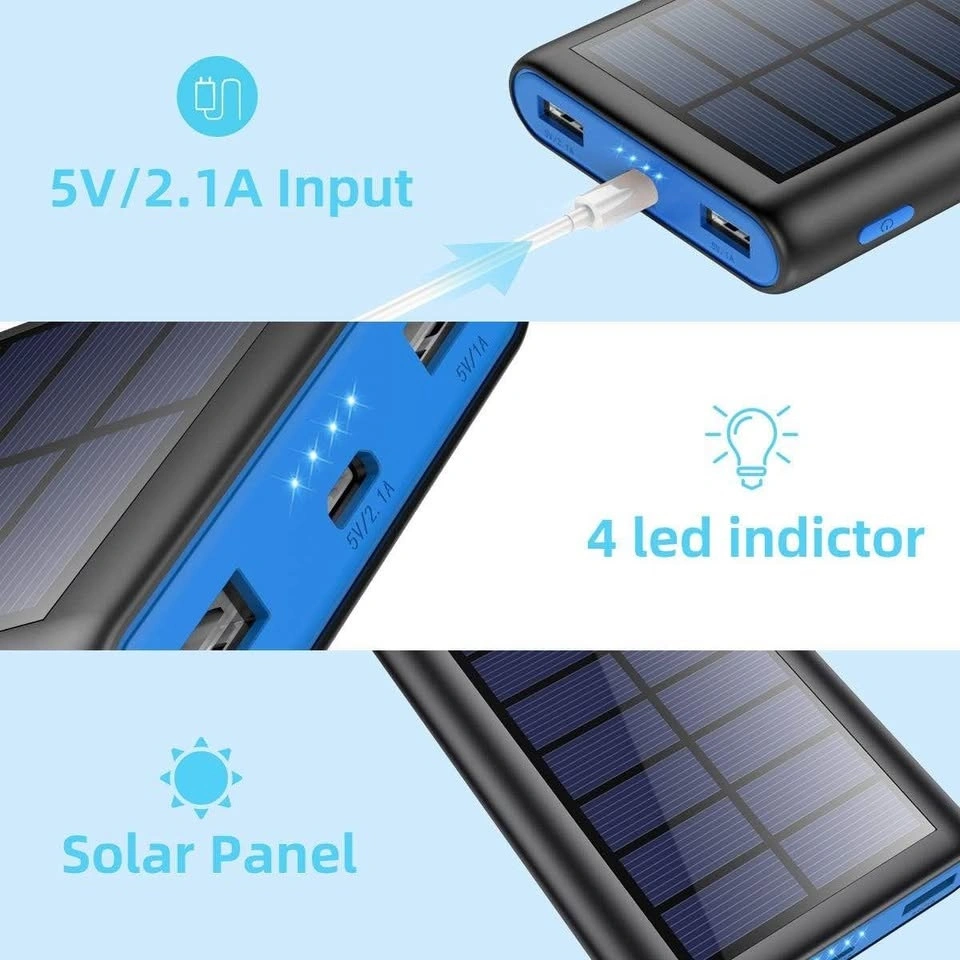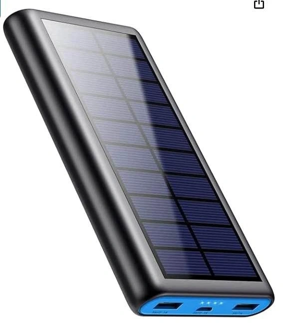This is a 26800mAh portable power bank with dual charging methods: via a 5V/2.1A adapter or its built-in solar panels for emergency backup. It's compatible with iPhones, iPads, Samsung Galaxy, and most other smartphones and tablets, capable of charging devices 6-8 times. Great for travel and outdoor activities. Please note the solar charging is intended as an emergency backup, not a primary power source.