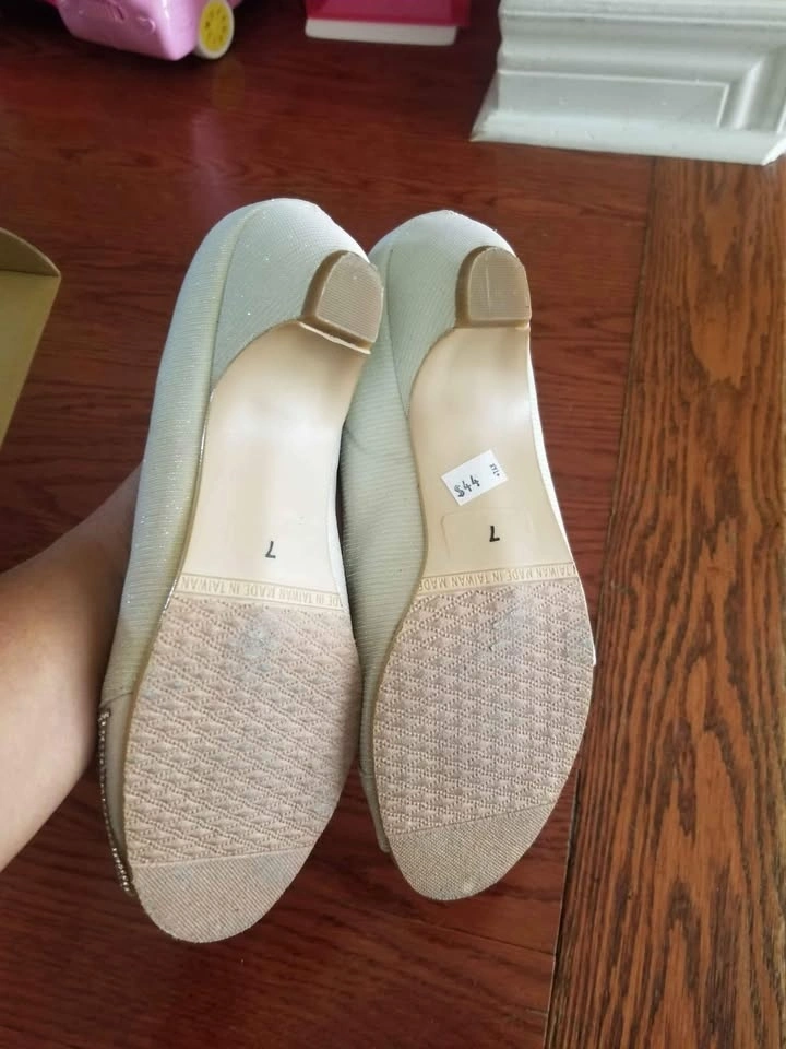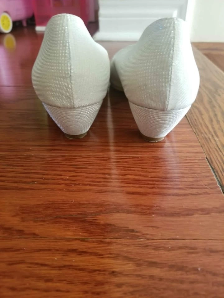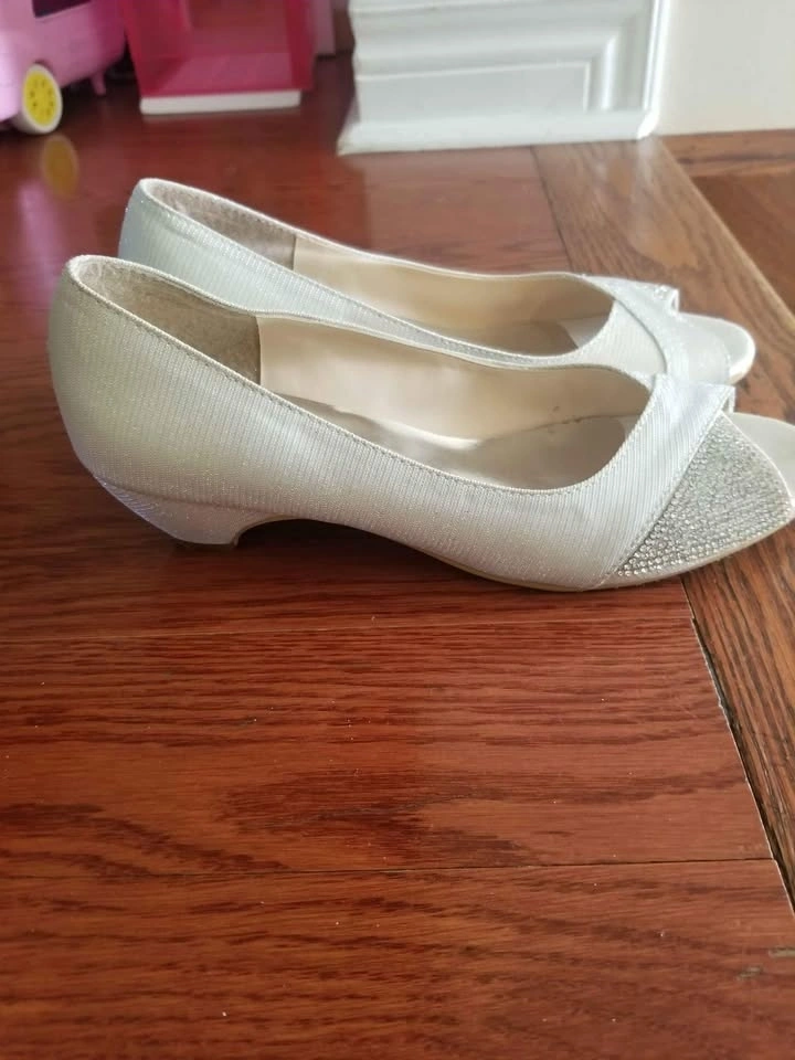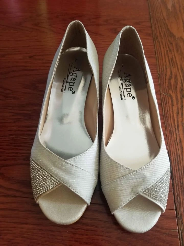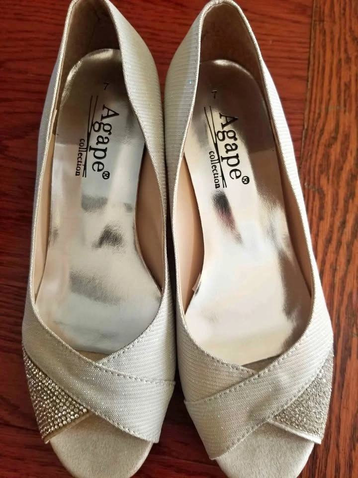 Women's heels, perfect for formal occasions. Wore only once for a wedding reception. Originally paid $44 plus taxes. White with rhinestones. Size: 7. Brand: Agape Collections.