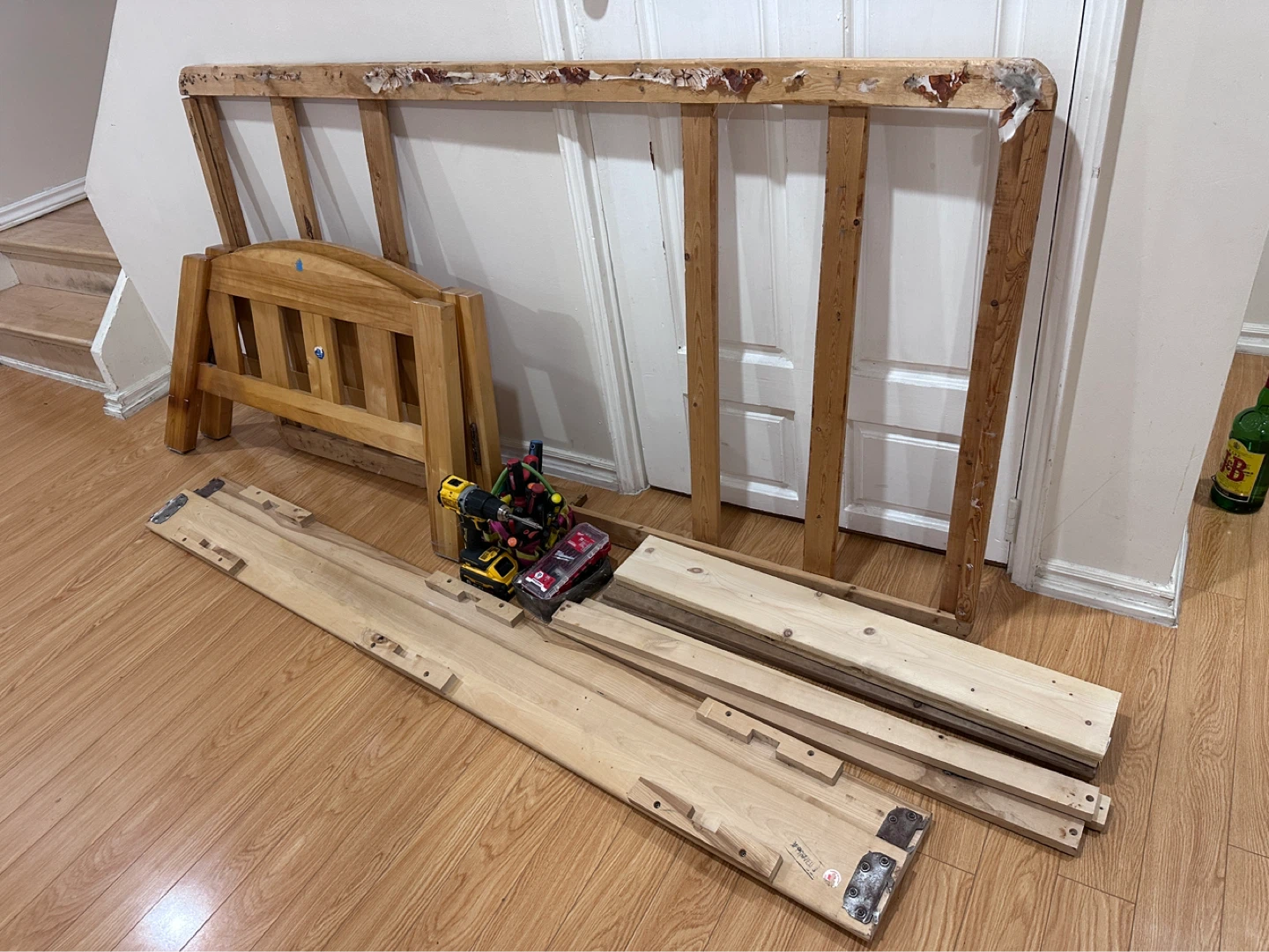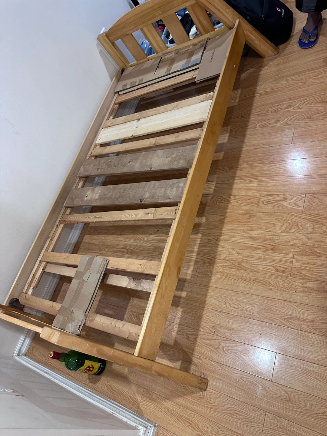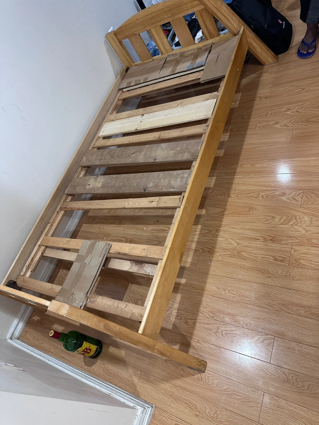 A light wood twin bed frame, comes with headboard and side rails. Slatted support base. Assembly required. Single bed frame is available for pick up Bristol and terryfox Bullrush drive