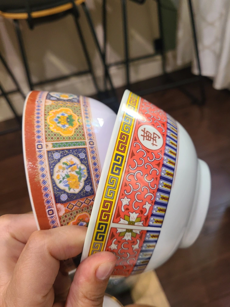 Selling a set of plates with a unique Asian-inspired design! They have a red and white pattern with floral accents and traditional symbols. Perfect for adding a touch of culture to your dining experience.