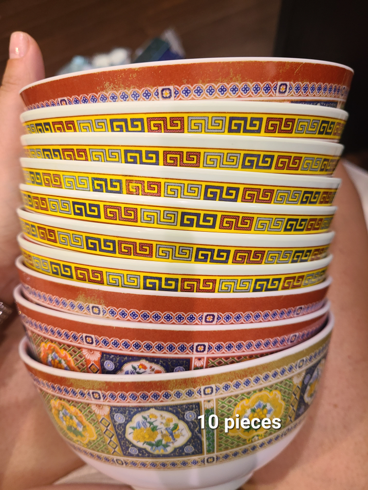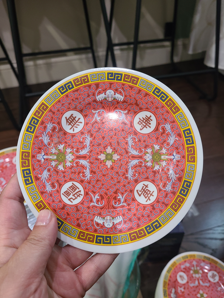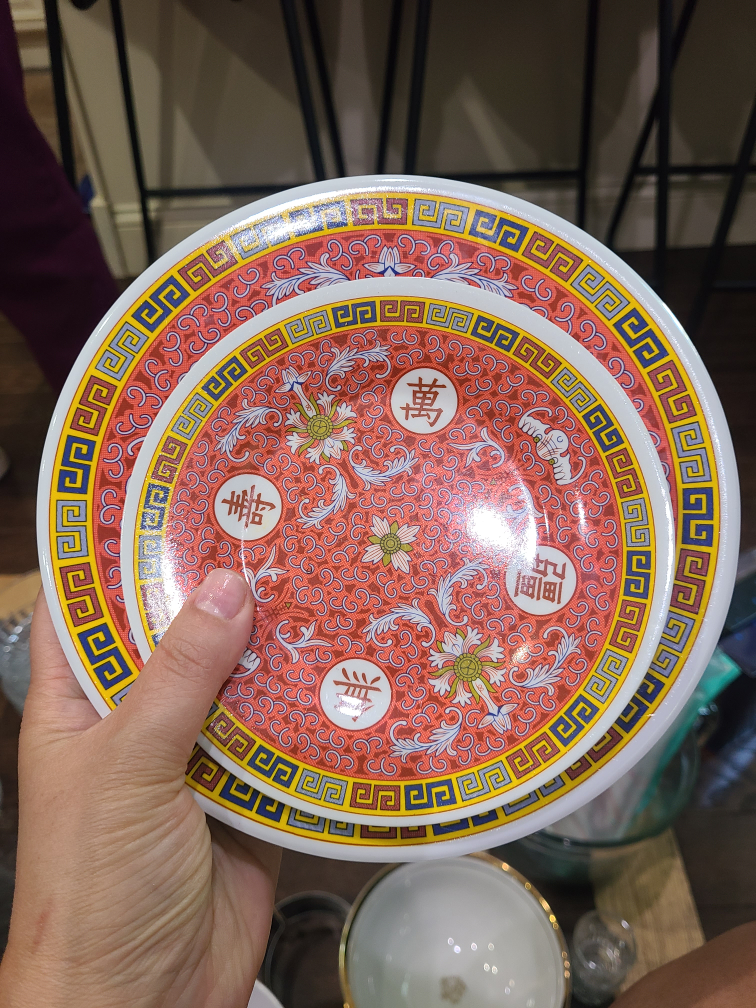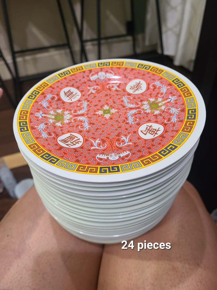 Selling a set of plates with a unique Asian-inspired design! They have a red and white pattern with floral accents and traditional symbols. Perfect for adding a touch of culture to your dining experience.