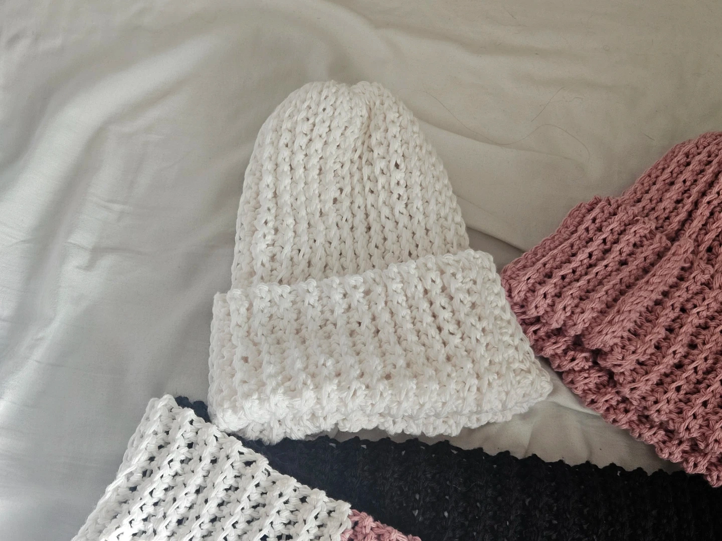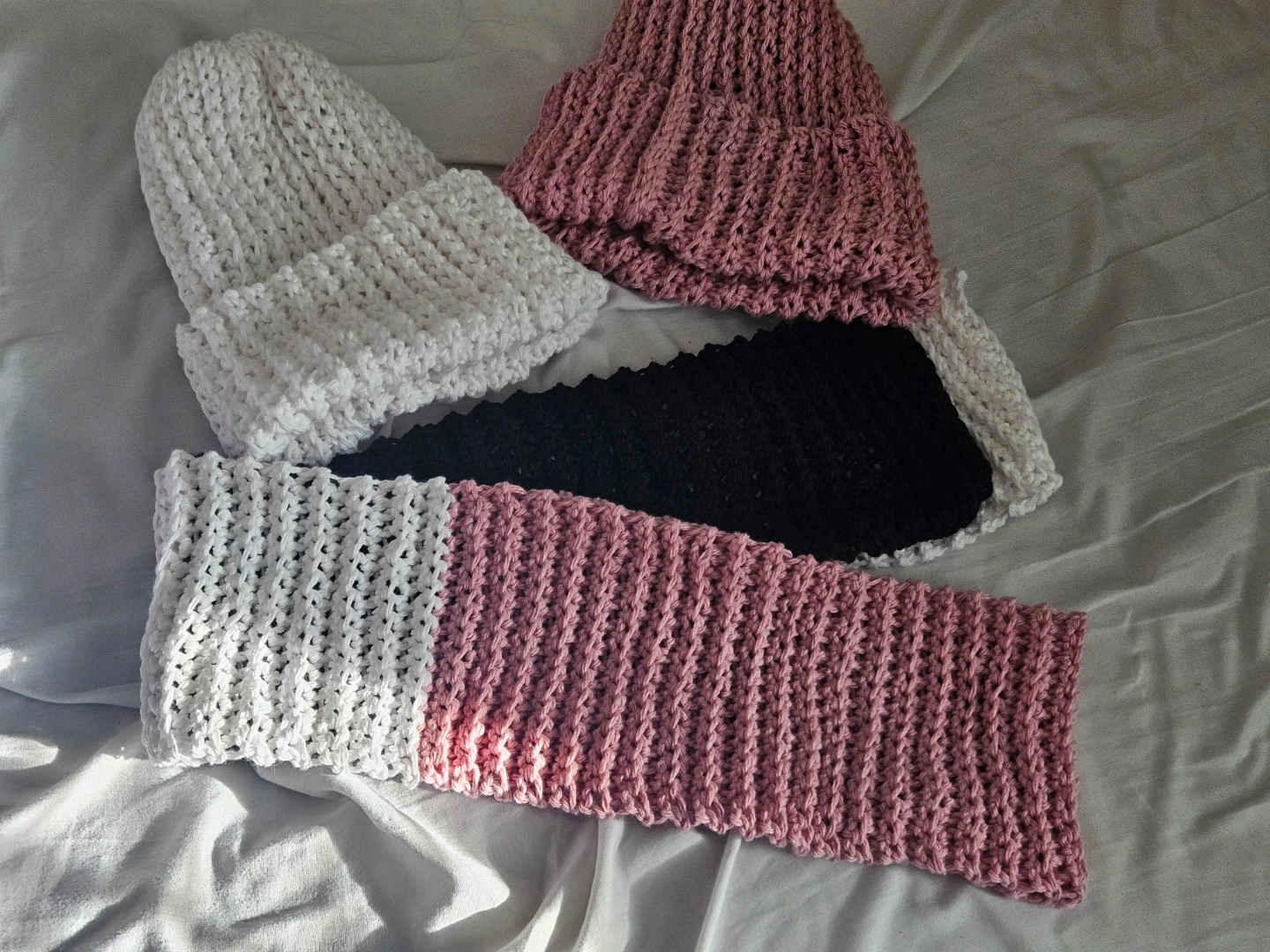 This set includes a white knitted hat with a pink knitted hat and a pink and white striped scarf. They're made from a soft, chunky yarn, perfect for keeping warm. The hats have a folded brim for extra coziness.