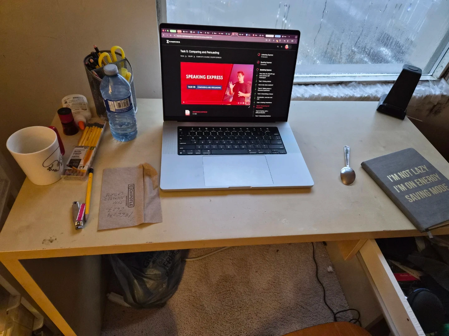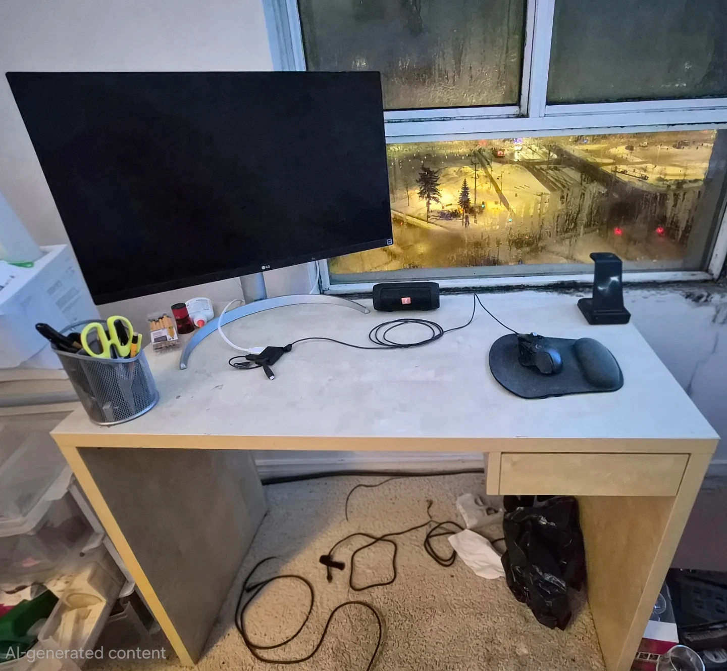 Simple wood desk with one drawer. It's great for a home office or study area. Measurements are approximately 47 inches wide, 23.5 inches deep, and 29 inches tall.