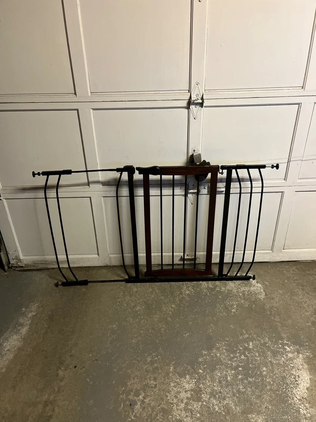 This is a pressure-mounted baby gate with a walk-through door. It's made of metal and wood accents. The gate is adjustable to fit different openings.
