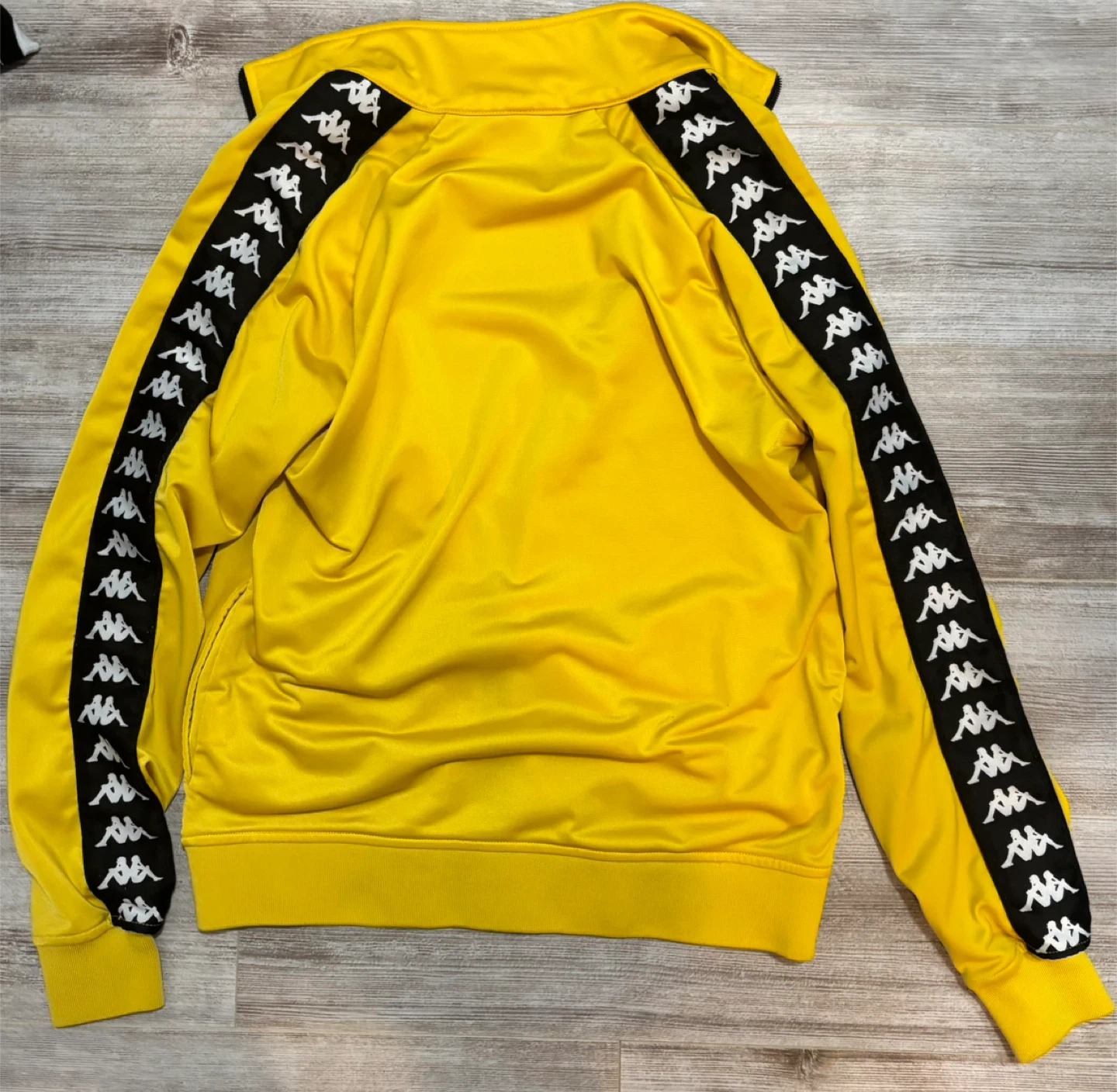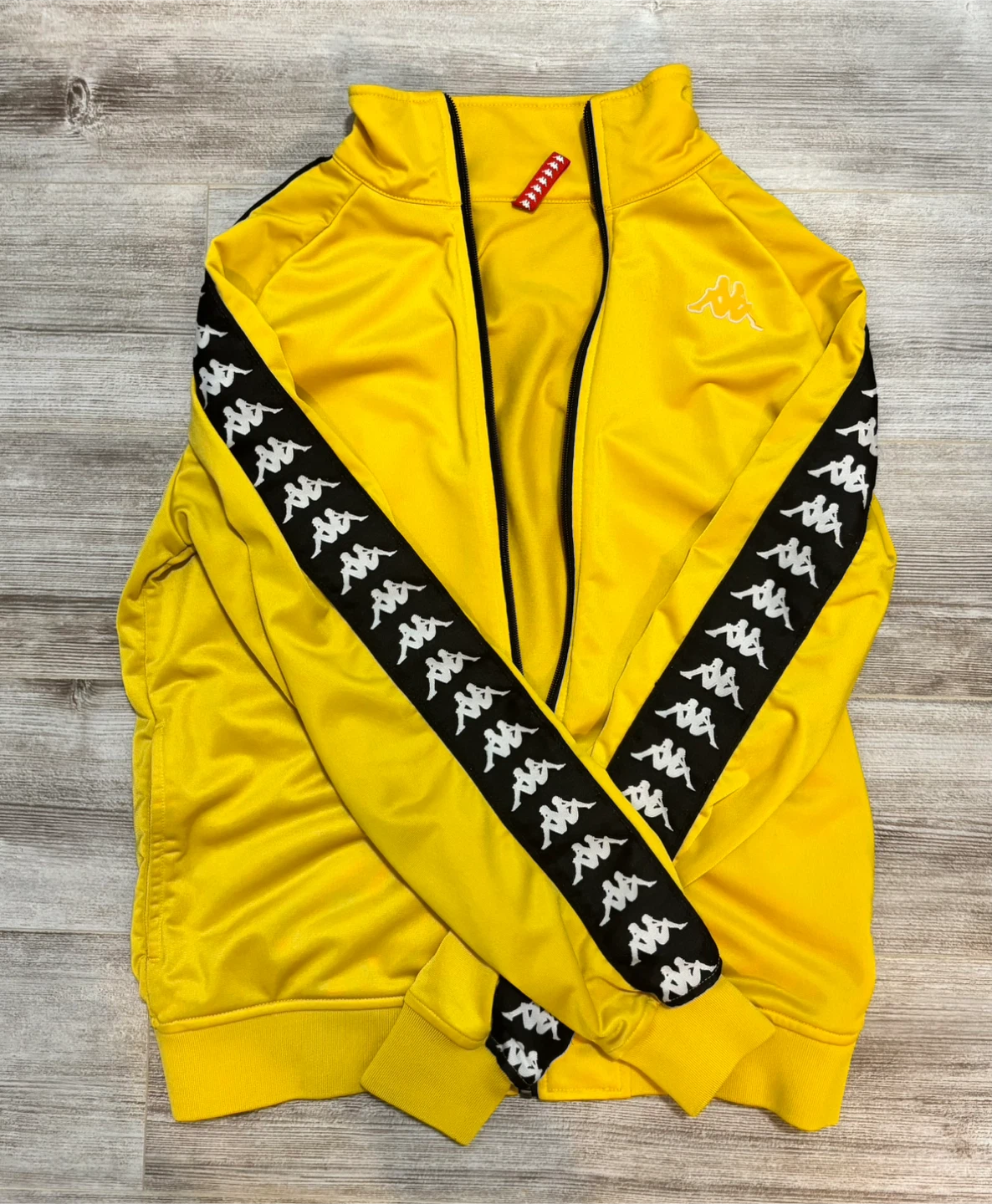 This yellow Kappa track jacket features the iconic Omini logo tape down the sleeves. It's a sporty and stylish zip-up. Made from a smooth, likely polyester blend. Great for casual wear!