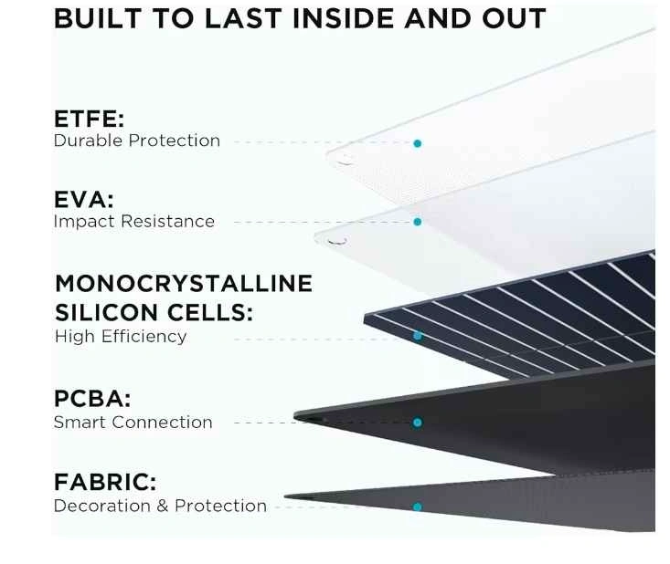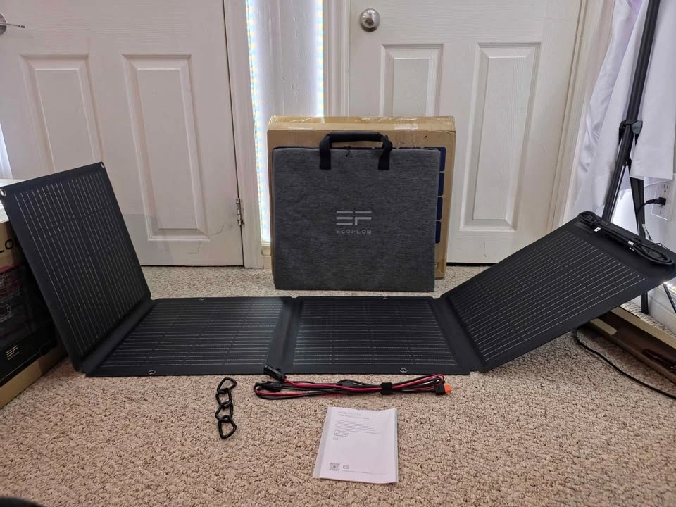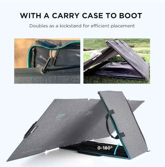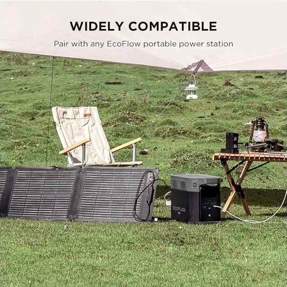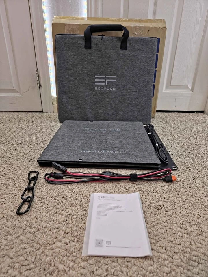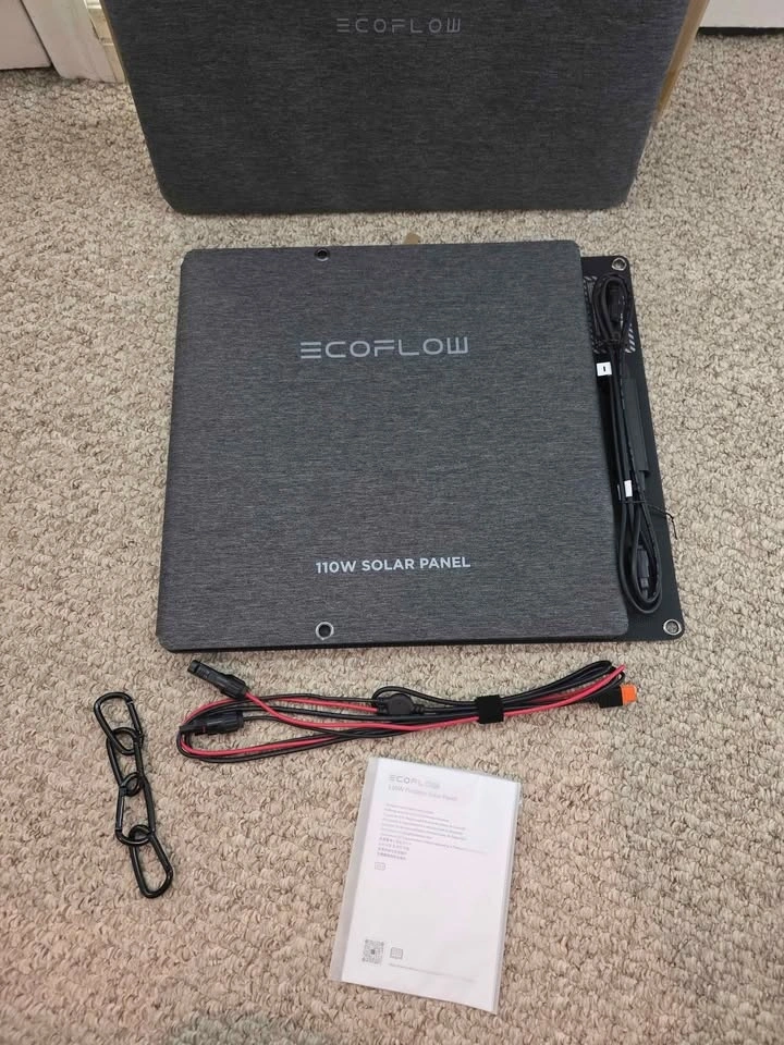 EcoFlow 110W Solar Panel with Monocrystalline cells for high efficiency (up to 23% conversion rate). It's IP68 rated for water and dust resistance. The panel folds compactly into a carry case that doubles as an adjustable kickstand (0-180°). Universally compatible with EcoFlow RIVER/DELTA stations and other generators. Let me know if you're interested!