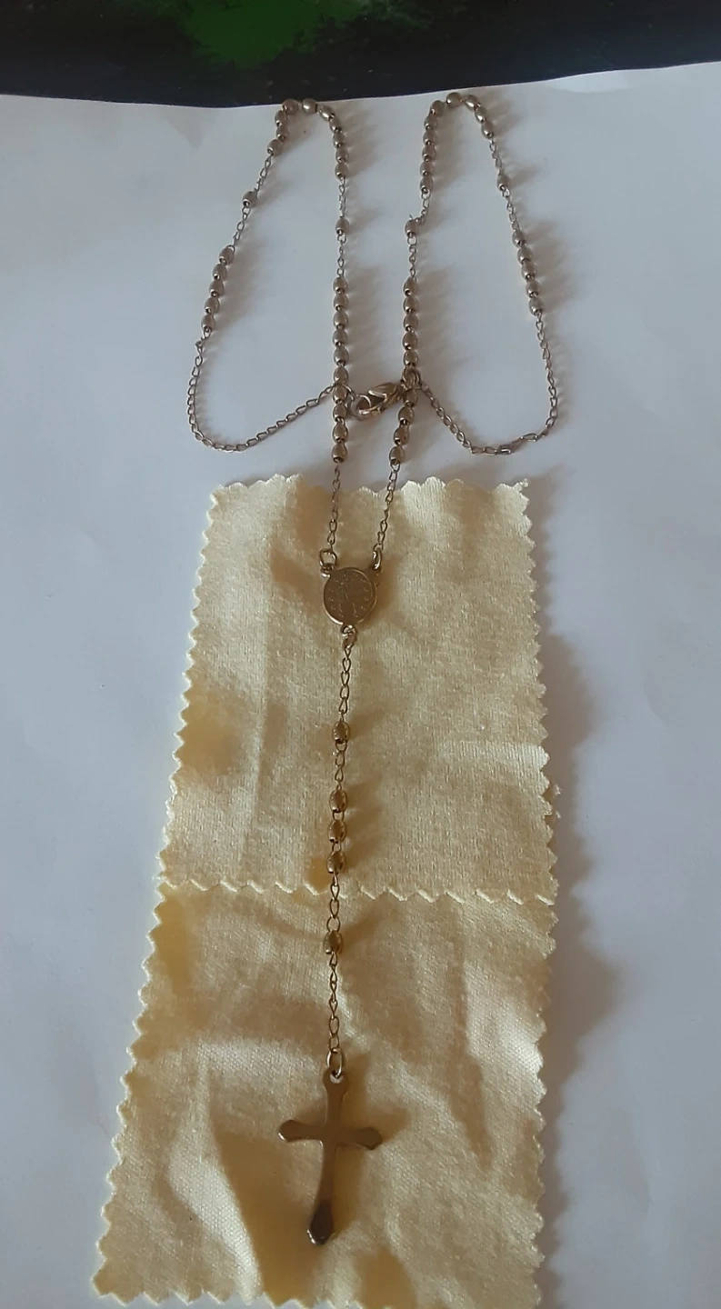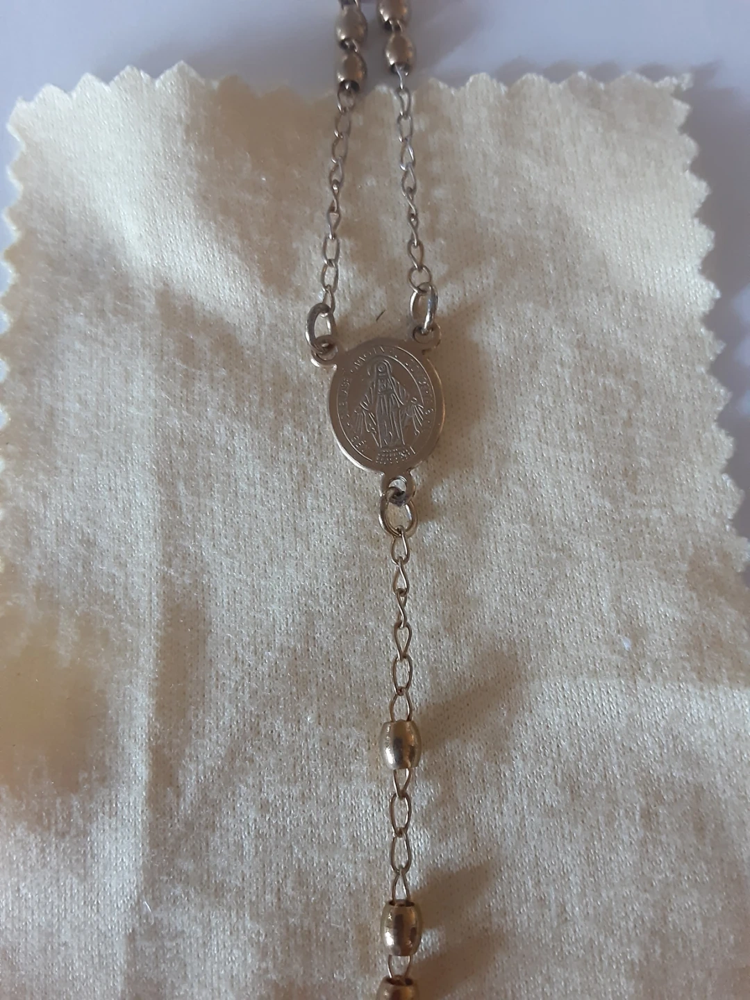 A simple silver tone rosary necklace with a crucifix and a medal of the Virgin Mary. It features small beaded sections between the chain links. This necklace is suitable for prayer or as a spiritual accessory.