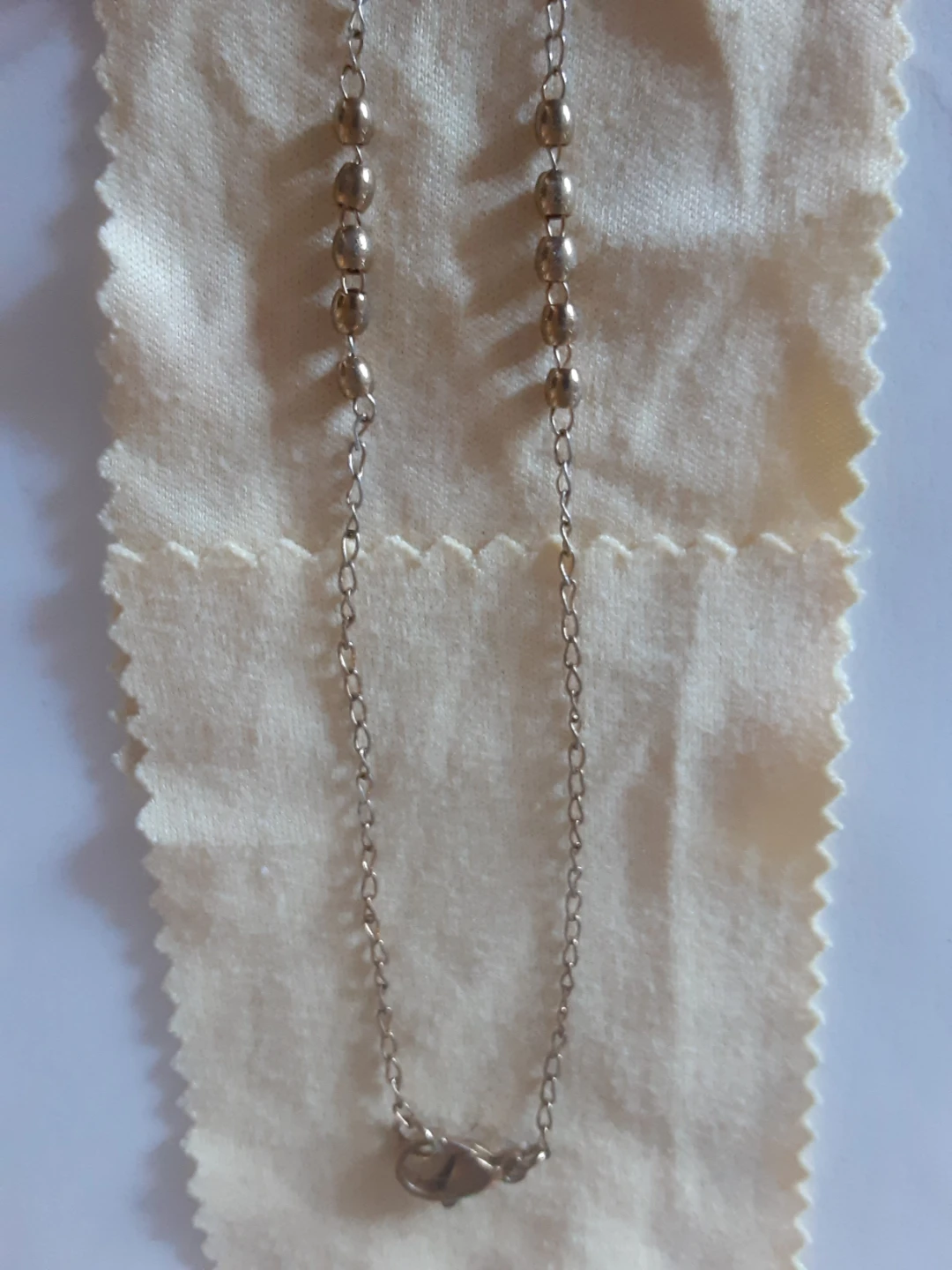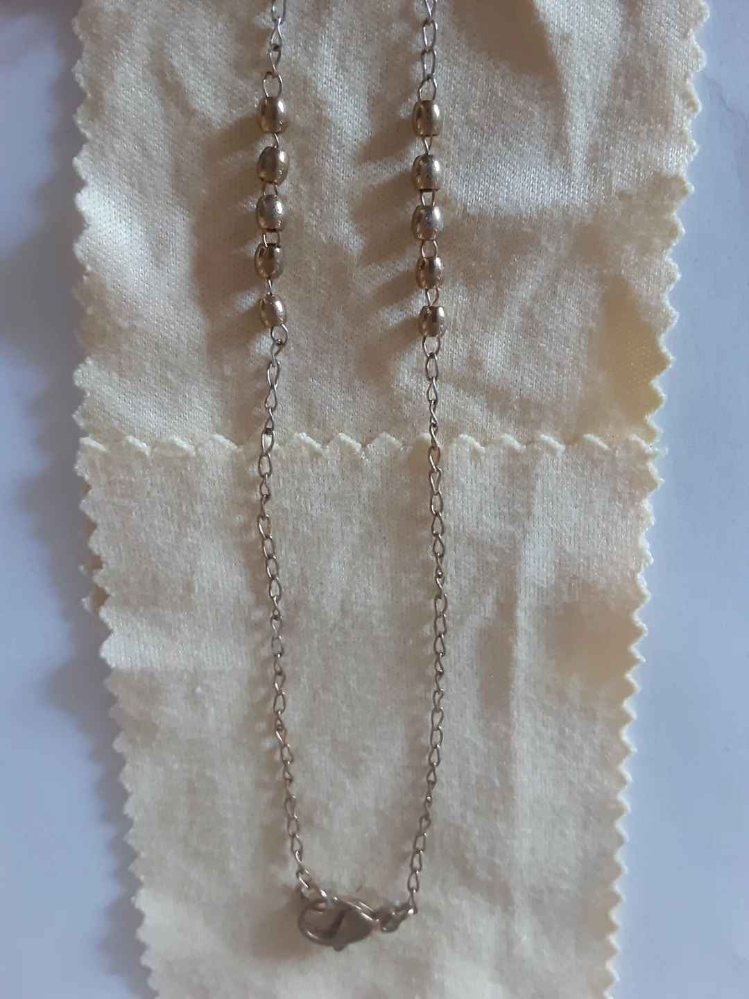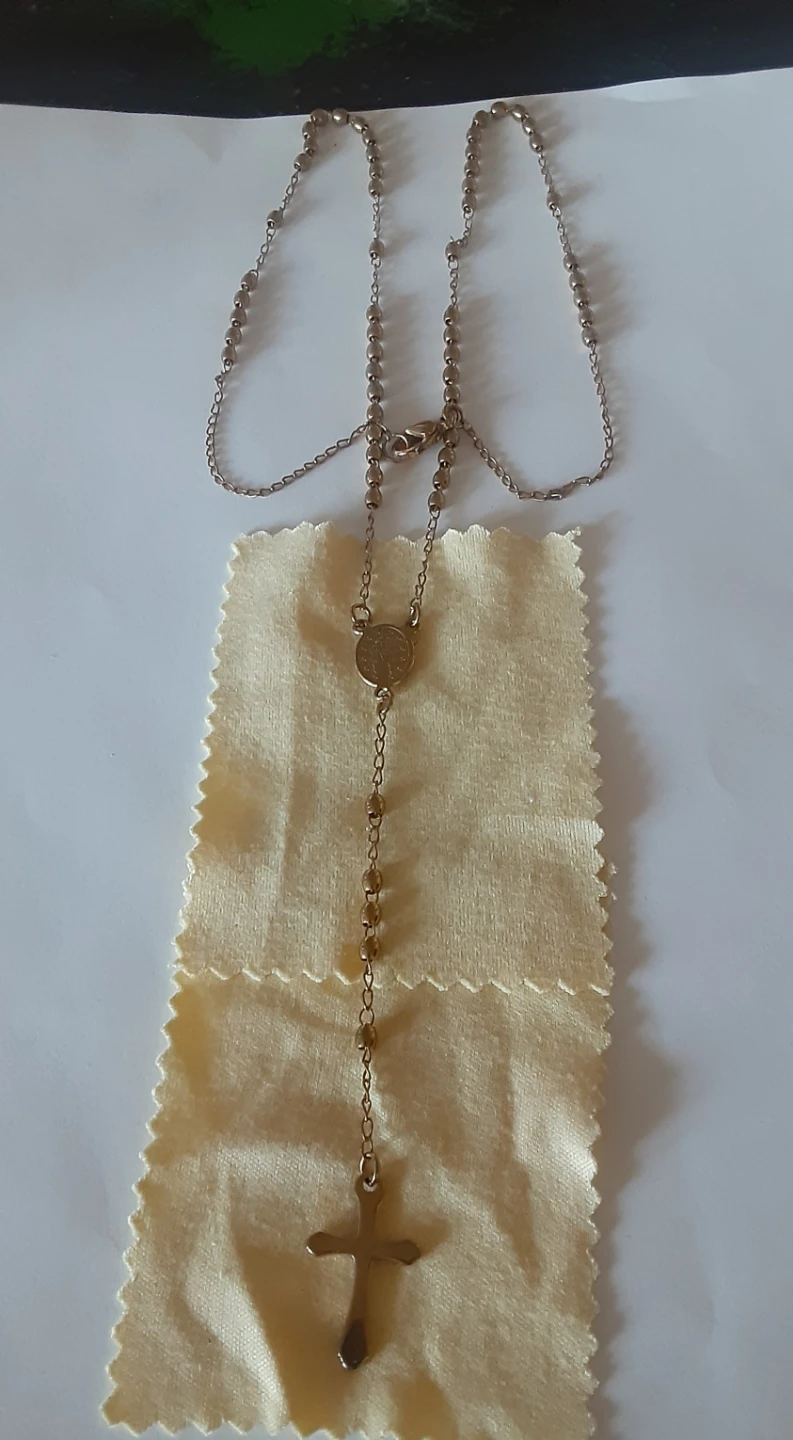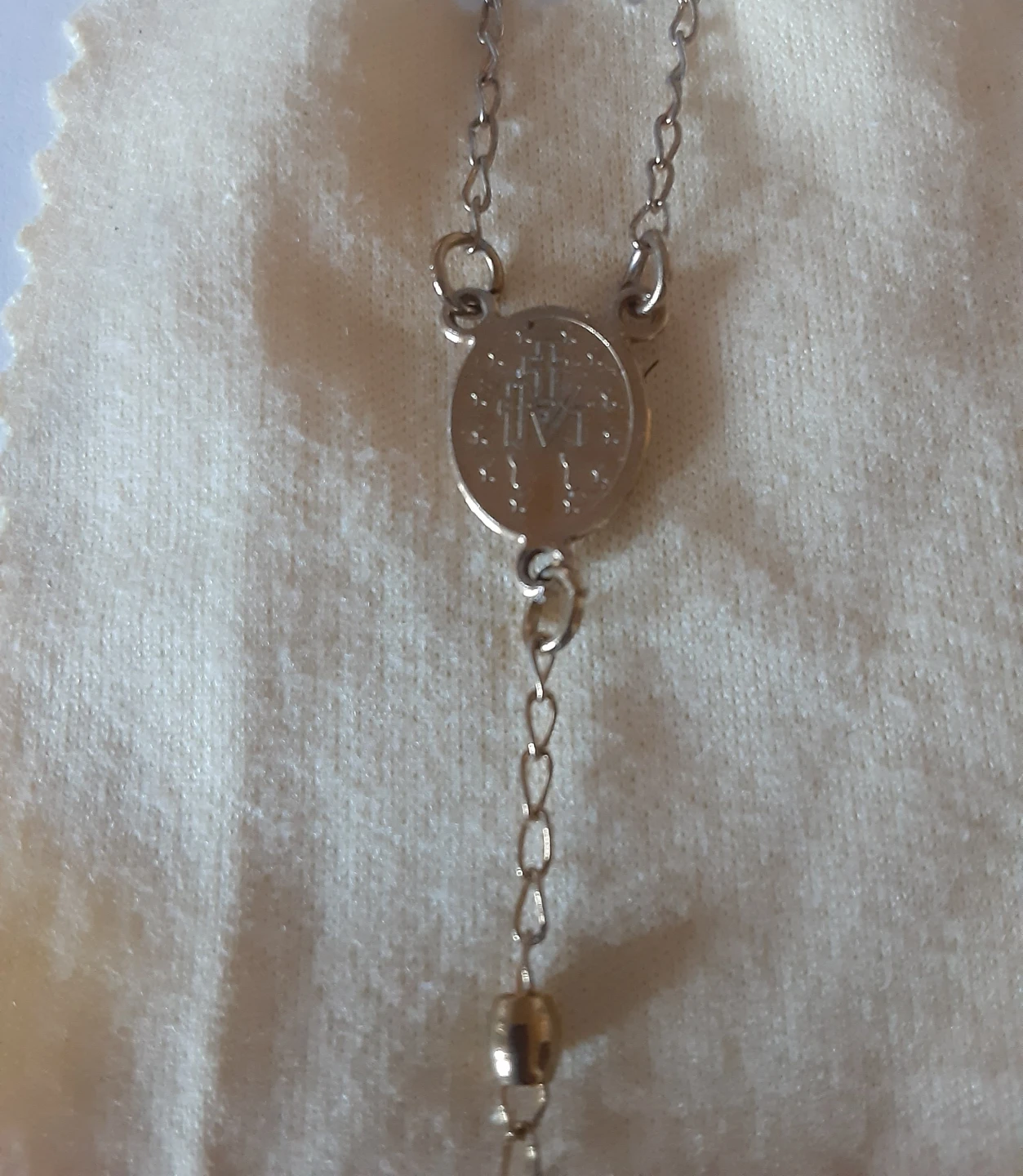 A simple silver tone rosary necklace with a crucifix and a medal of the Virgin Mary. It features small beaded sections between the chain links. This necklace is suitable for prayer or as a spiritual accessory.