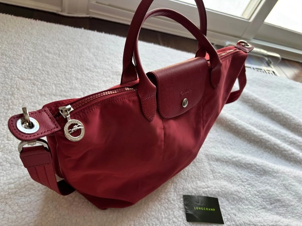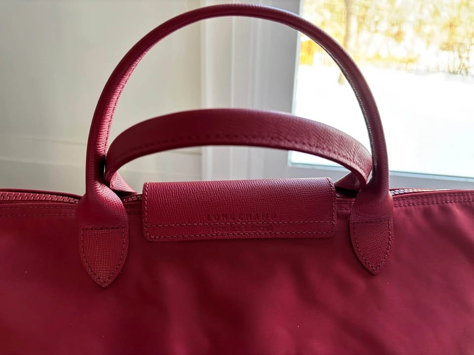 Longchamp Le Pliage Neo Medium tote bag in red with leather trim and a removable shoulder strap. Preferably pick up near 16th and 9th line.