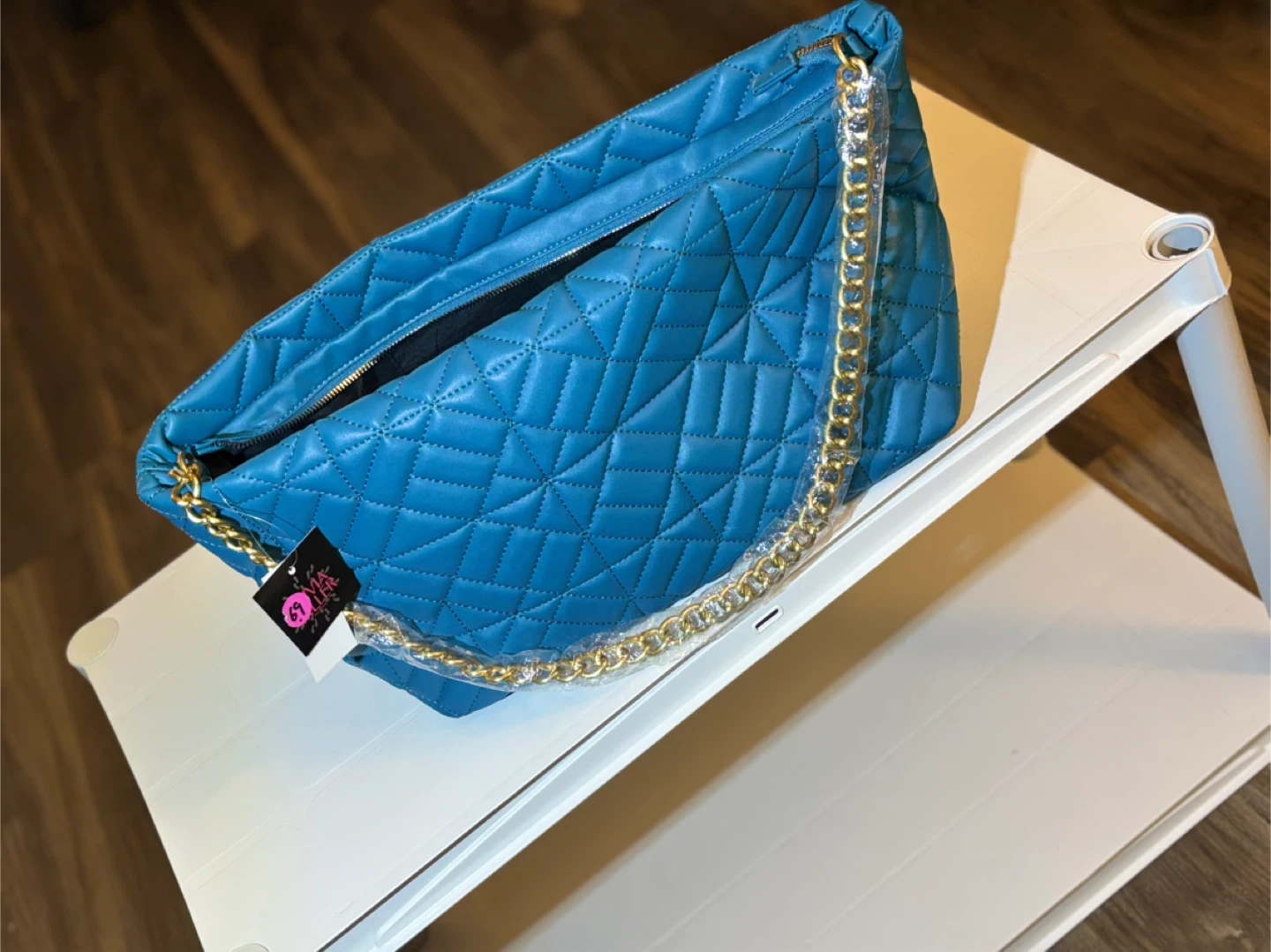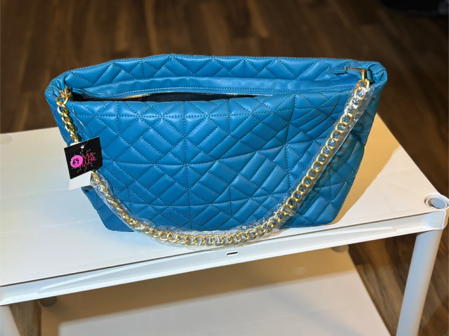 This stylish handbag is blue with a quilted diamond pattern. It features a gold chain strap and a zippered closure. A must-have accessory!
