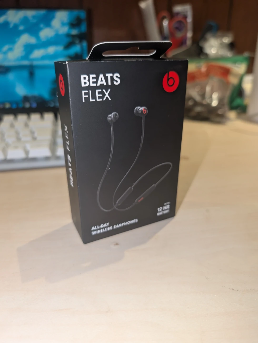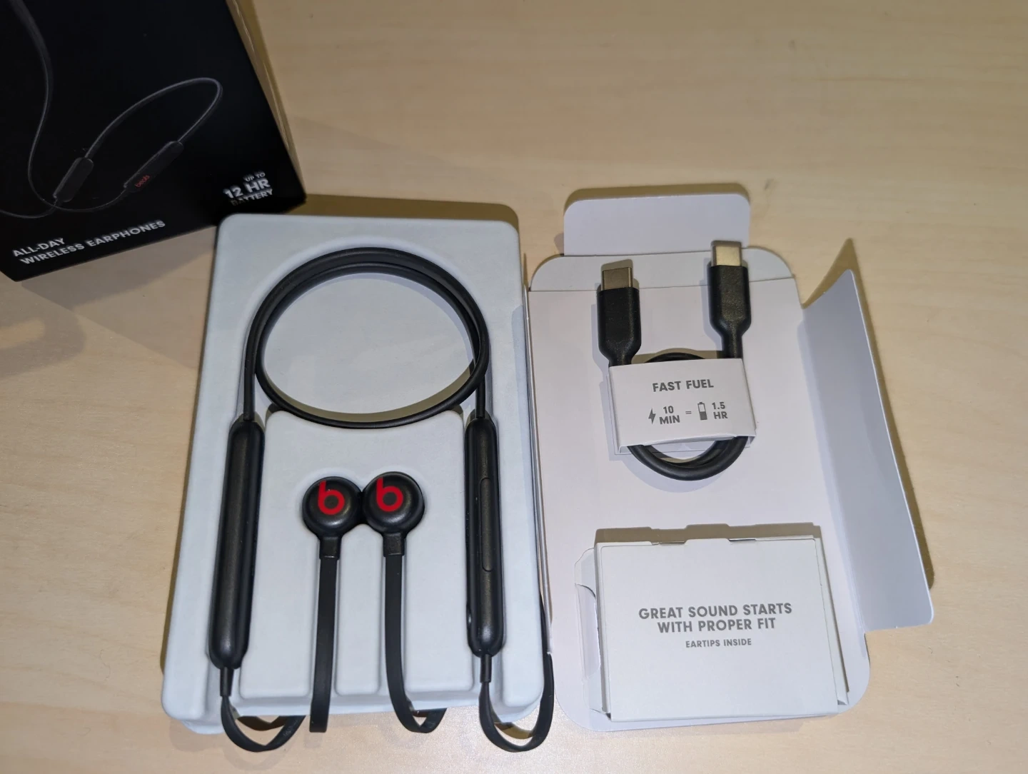 Beats Flex all-day wireless earphones. Comes with USB-C charging cable and eartips. Up to 12 hours battery life. Fast Fuel feature gives 1.5 hours of playback from a 10-minute charge.