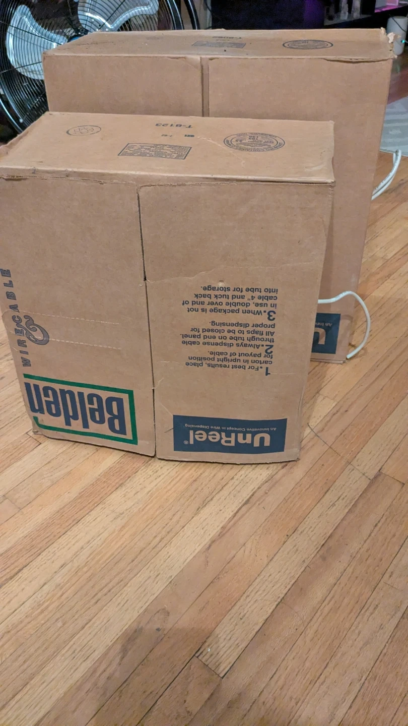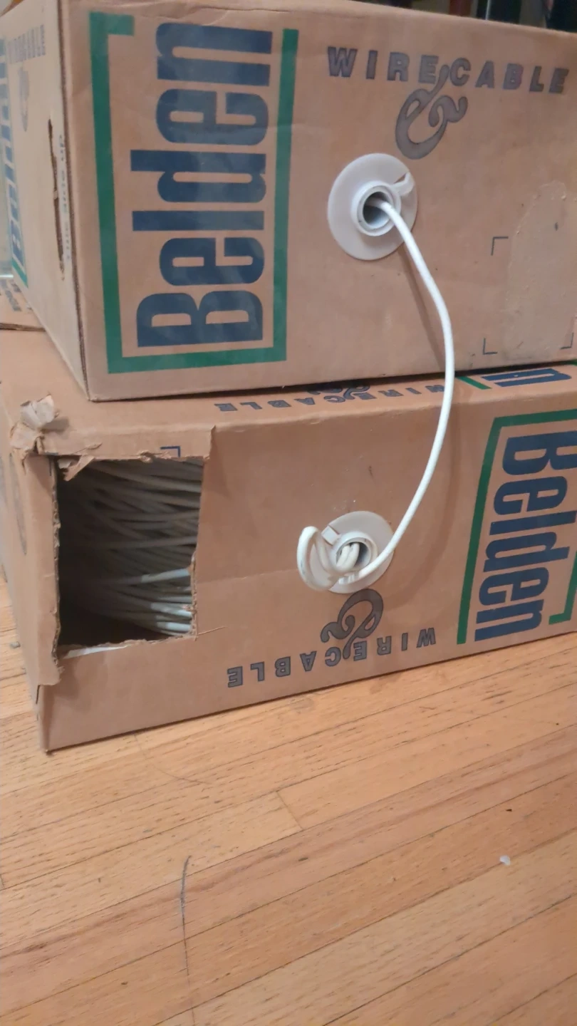 1 Slightly used and 1 new Box of Belden wire cable. The boxes have a Lewisburg Container Box Certificate for singlewall construction. Edge crush test (ECT) is 55 lbs/in, with a size limit of 105 inches and a gross weight limit of 120 lbs. The price includes both boxes