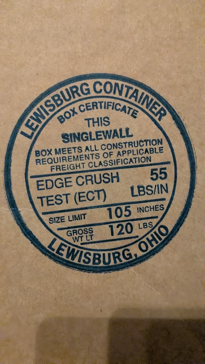 1 Slightly used and 1 new Box of Belden wire cable. The boxes have a Lewisburg Container Box Certificate for singlewall construction. Edge crush test (ECT) is 55 lbs/in, with a size limit of 105 inches and a gross weight limit of 120 lbs. The price includes both boxes