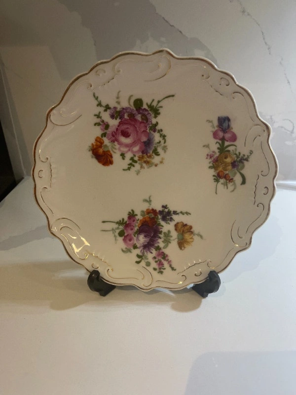 This pretty plate has a rococo style pattern and is embellished with gold trim. Hand-painted purple and pink flowers are on the plate. Measures: 7 ½ " in diameter. Condition: Used - Like new. For Sale By: Owner. Curbside pick up: Yes. Cash accepted: Yes.