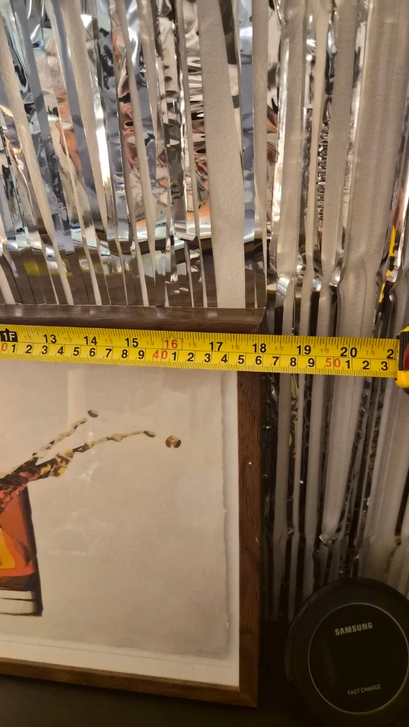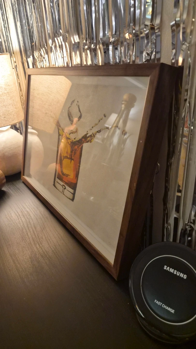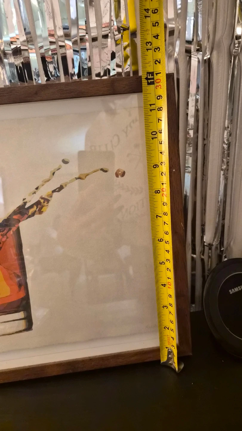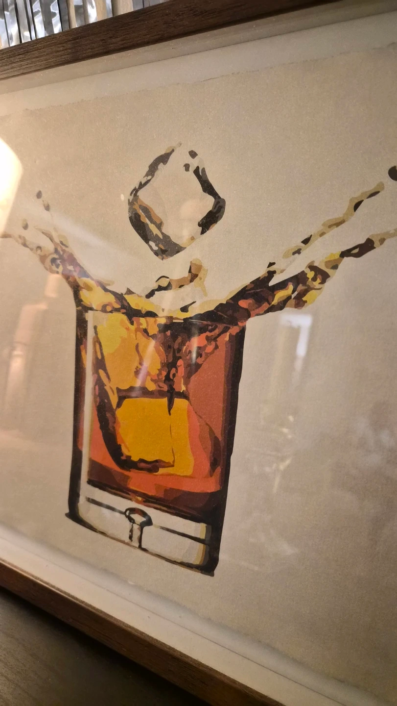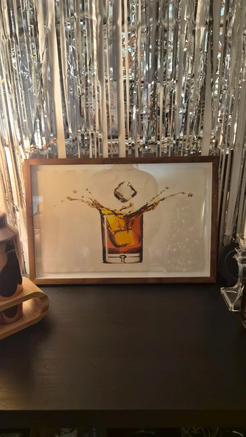 Framed art print featuring a whiskey glass and ice. The frame is a dark wood colour. It measures approximately 19 inches in length and 13 inches in width.