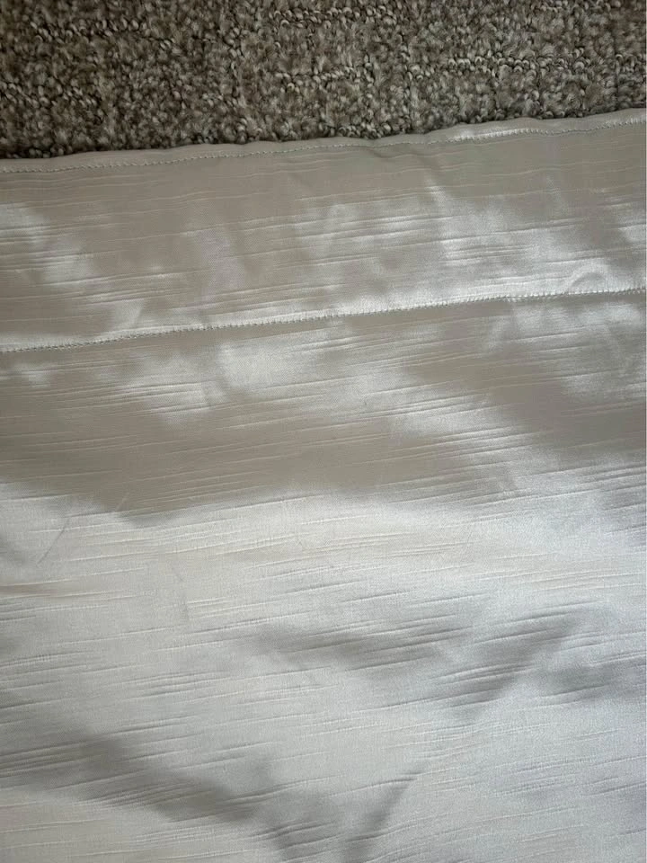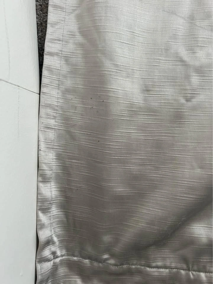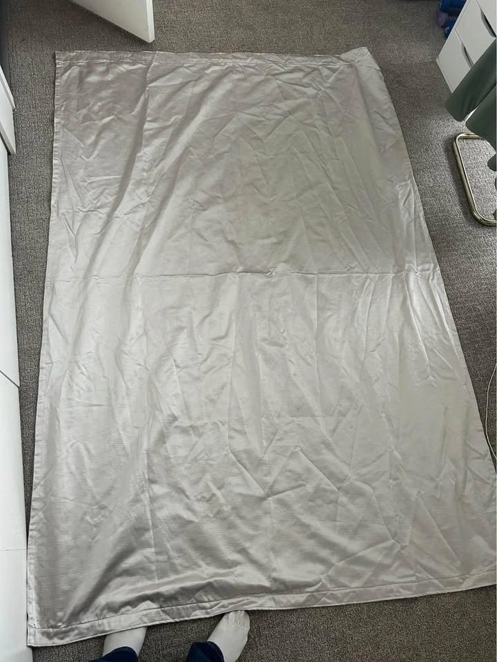 Selling these curtains I made myself. They measure 140 cm x 210 cm. The opening for the rod is 5.5cm. There are a few faint marks on one that will probably come off in the wash but are barely noticeable (see pics). The fabric is a gorgeous metallic colour that looks silver with a warm undertone. It looks best in person. I made them a few years ago and had them in storage (vacuum sealed so they’re wrinkly in the photo but you can steam them). I cannot remember what the fabric type is so best to wash on delicate or hand wash cycle and hang to dry. Comes with 3x Ikea brackets but NOT the pole. Pickup in River District.