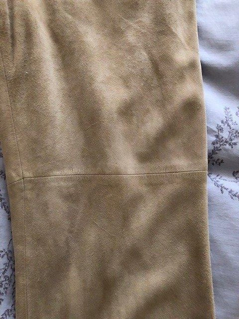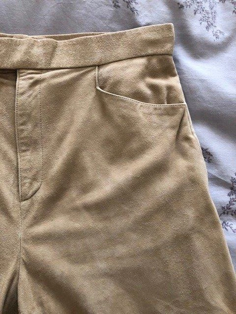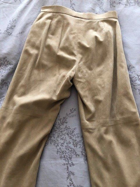 Size 8 (but more like 6) tan butter soft REAL suede pants. 100% acetate lining. Gently worn and well taken care of. The inseam is about 30 inches. Two functional front pockets. There are some scuff marks on the inside hem of the pant legs that is not visible from the outside.