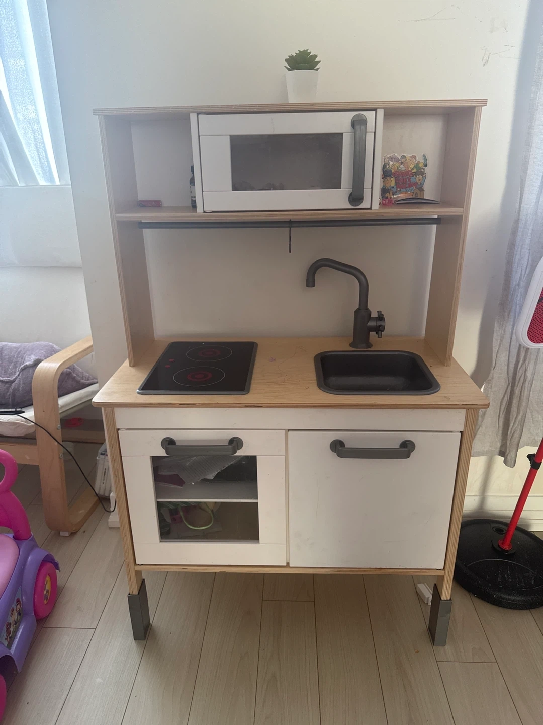 This is a fun play kitchen for kids, complete with a microwave, stovetop, and sink. It's got cabinets for storage and is made of wood. Great for imaginative play!