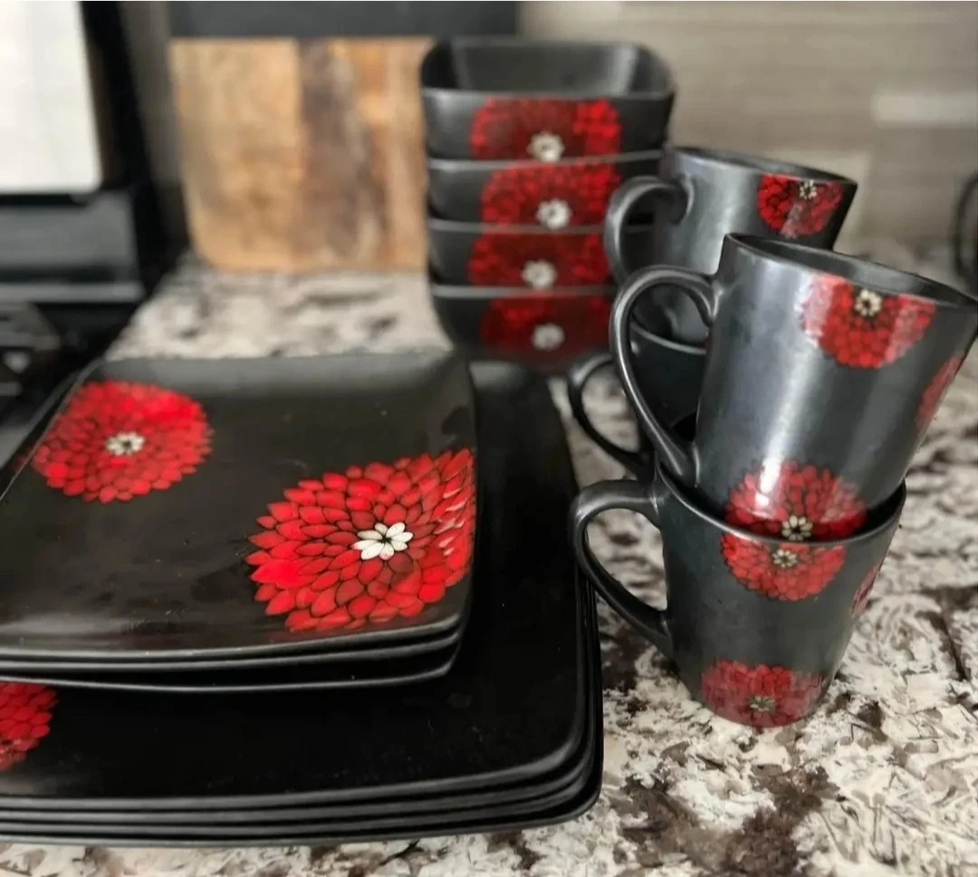 Red & Black Floral Dinnerware Set
