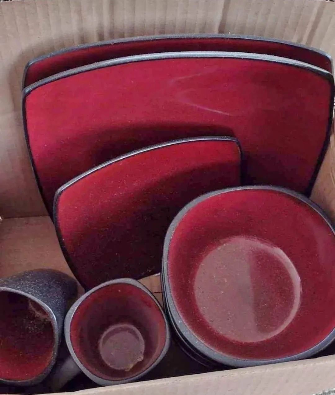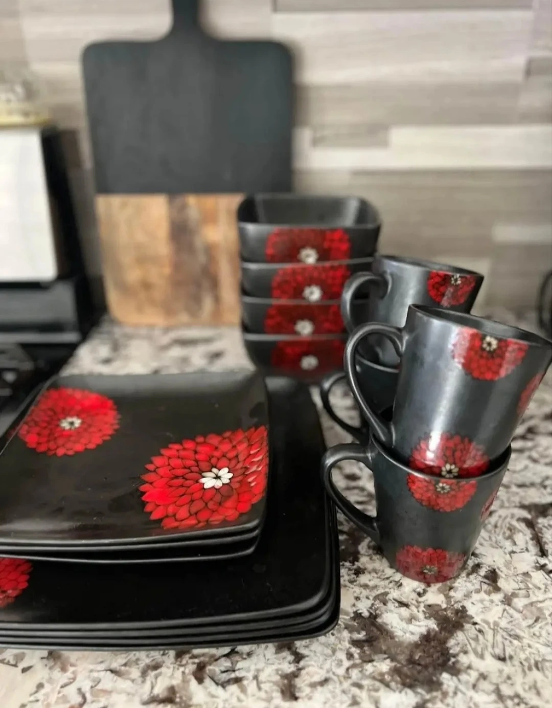 Selling a dinnerware set with a unique red and white floral design on a black background! This set includes square plates, bowls, and mugs. The set is in great condition and comes with the original box