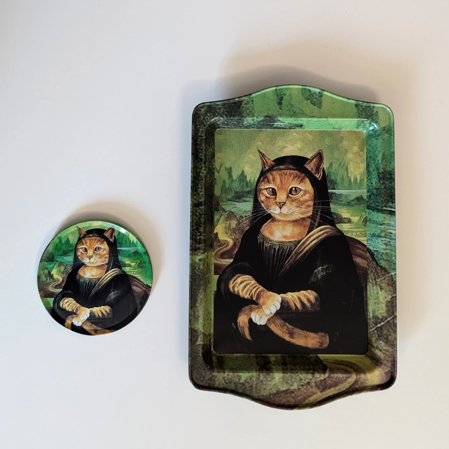 Small decorative metal tray featuring cat artwork.