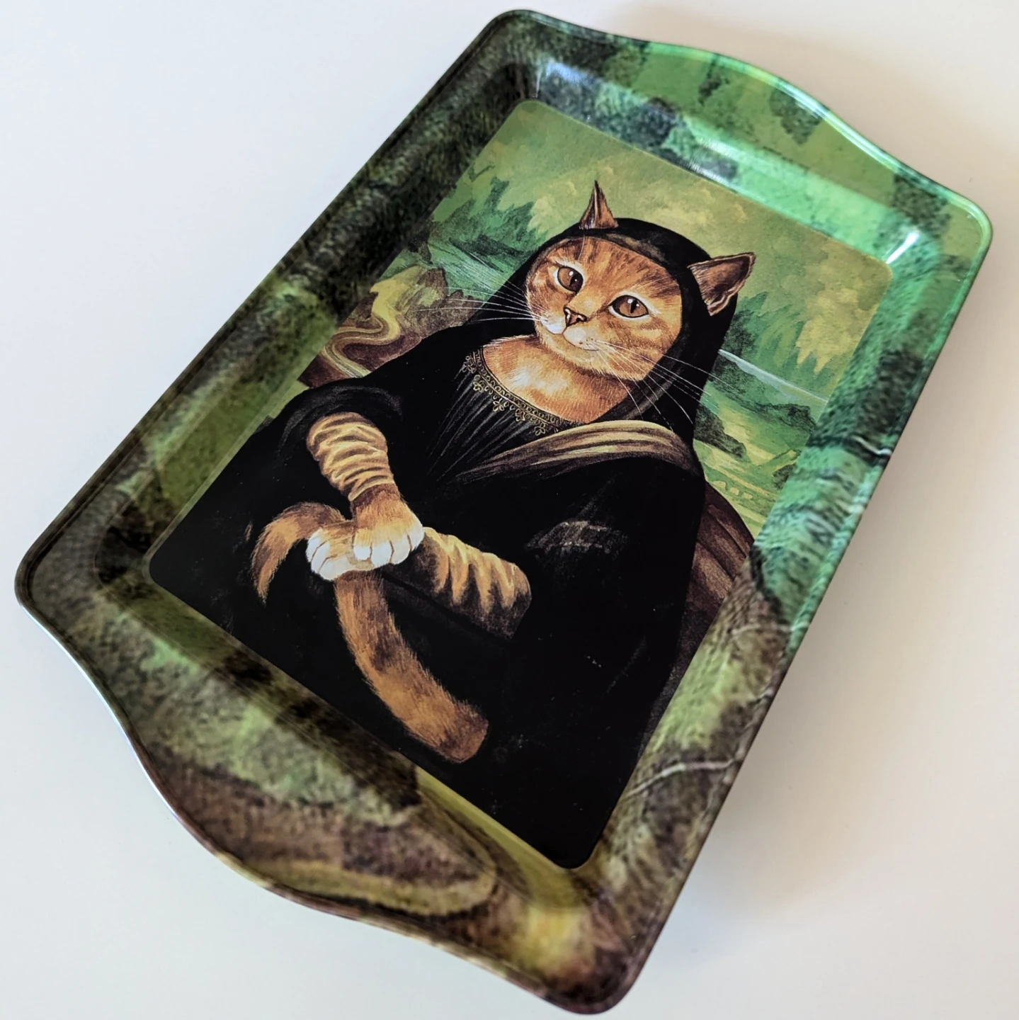 Small decorative metal tray featuring cat artwork.