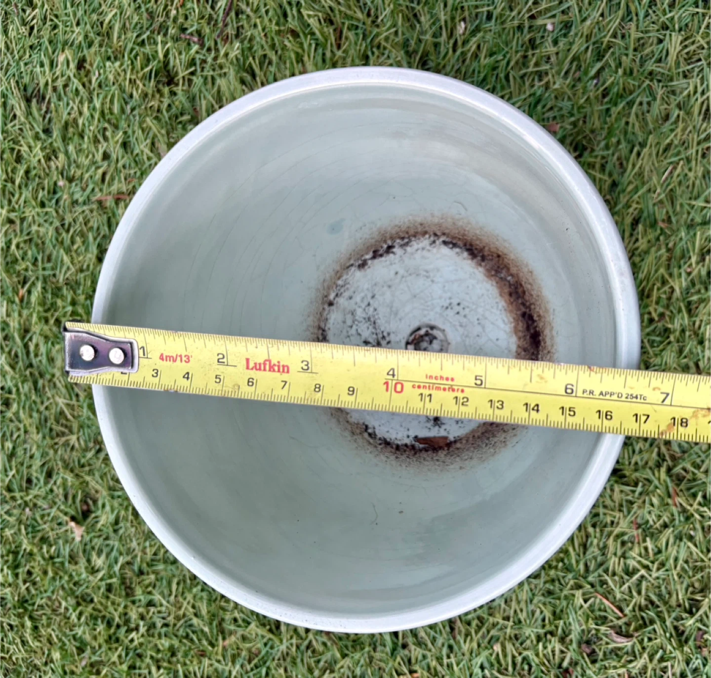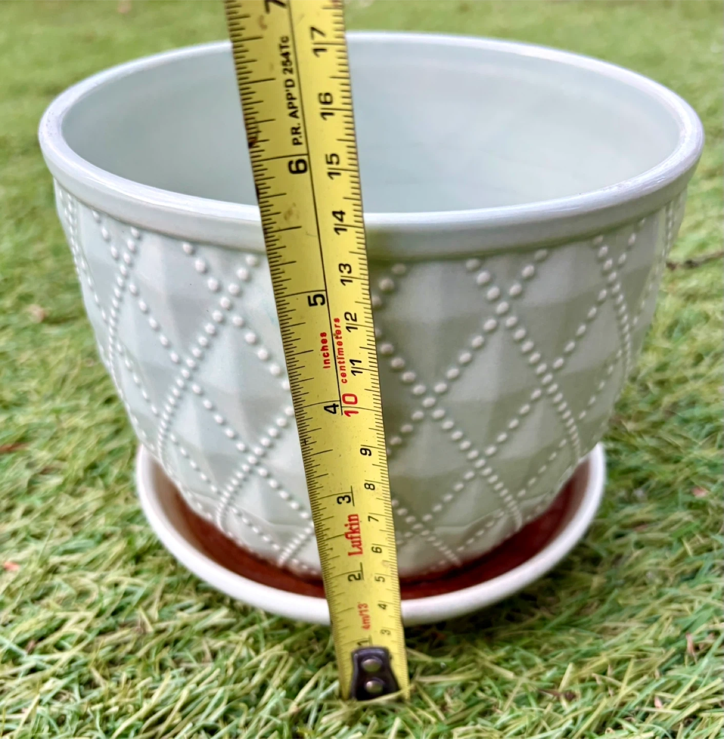 Two decorative ceramic planters in a sage green hue, each with a matching saucer. One planter is in excellent condition, while the other shows some soil residue inside. The diamond-patterned texture adds a stylish touch to these pots.