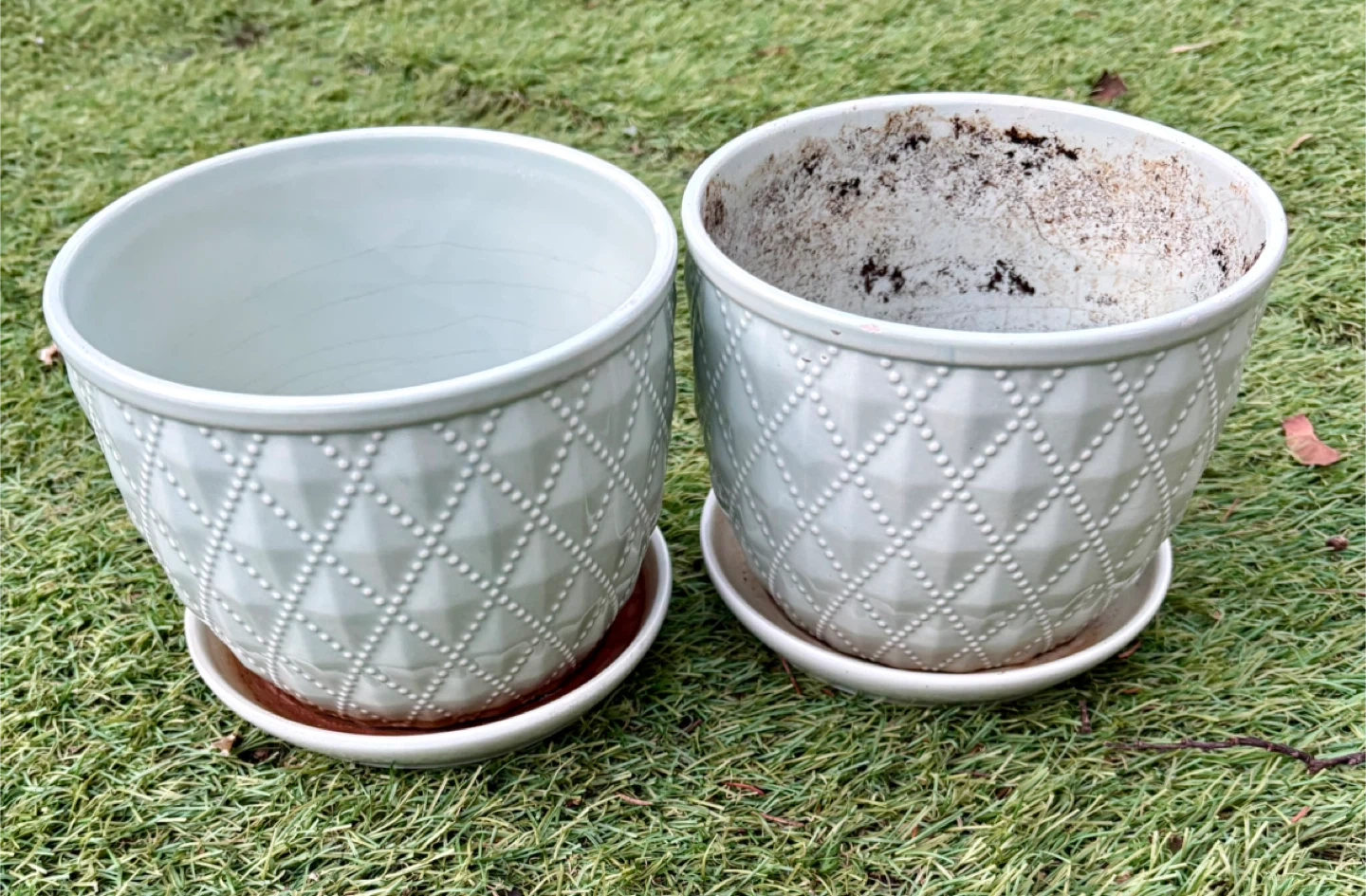 Two decorative ceramic planters in a sage green hue, each with a matching saucer. One planter is in excellent condition, while the other shows some soil residue inside. The diamond-patterned texture adds a stylish touch to these pots.