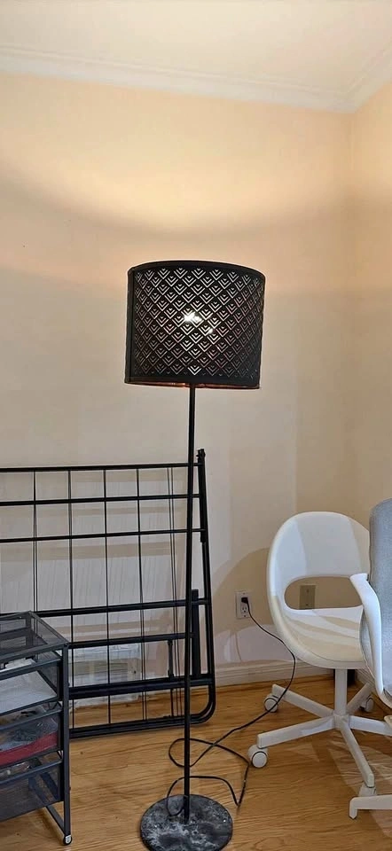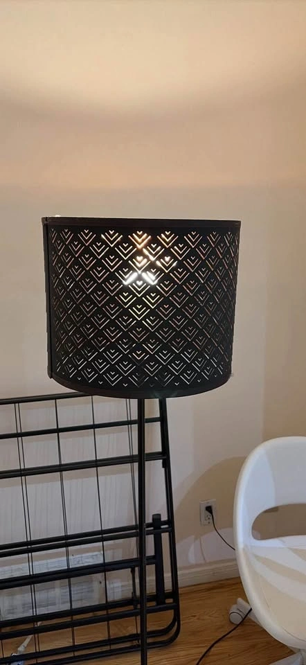 Black metal floor lamp with a unique laser-cut geometric pattern on the drum shade. The base is weighted metal with a matching black finish. The lamp is corded with a floor switch and provides warm ambient light through the shade cutouts.