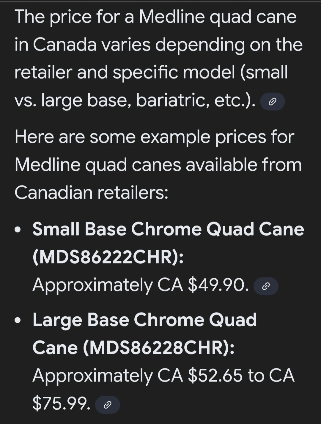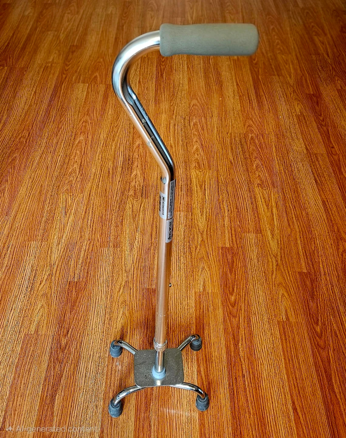 This is a Medline chrome quad with max weight capacity of 300 lbs (136 kg). This cane provides stable support for walking with adjustable height.