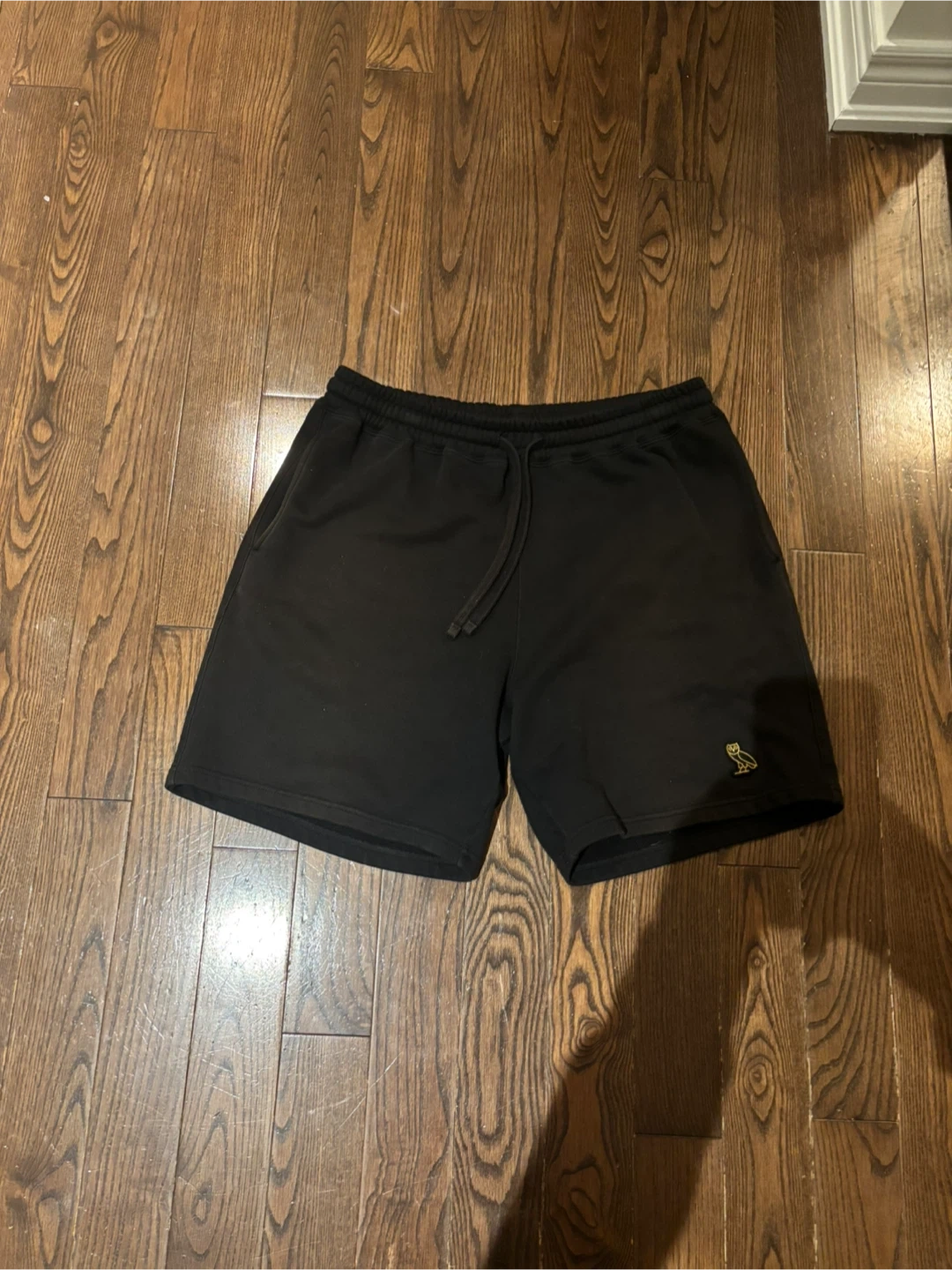 These are black sweat shorts from October's Very Own. They're a size large and feature the iconic OVO owl logo embroidered on the lower left leg.