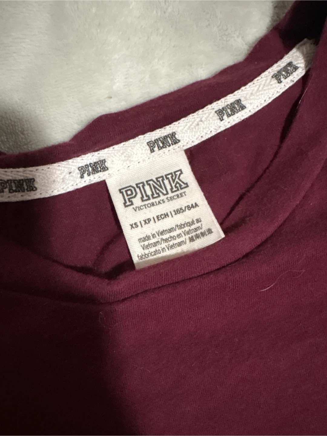 This is a Victoria's Secret PINK cropped t-shirt in maroon. It's a size XS and made in Vietnam. It's a comfy staple for casual wear!