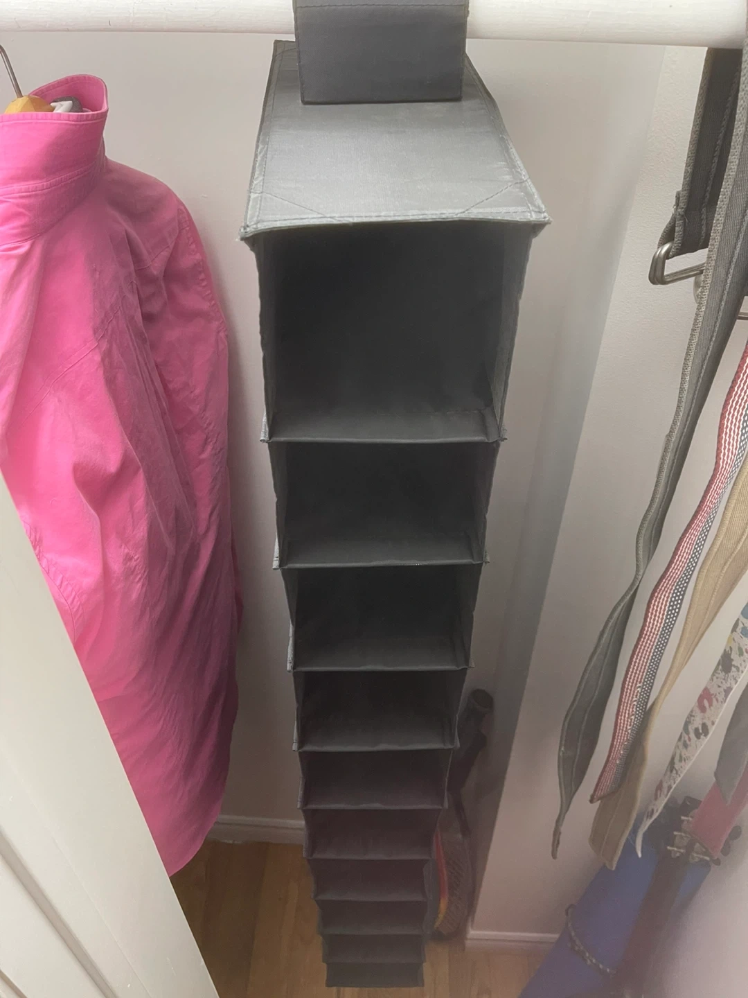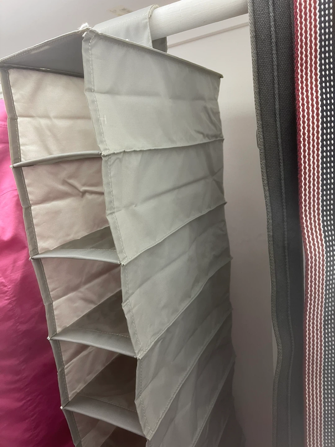 This is a hanging closet organizer with multiple shelves. It's made of fabric and hangs from a closet rod. It's great for storing shoes, accessories, or other items.
