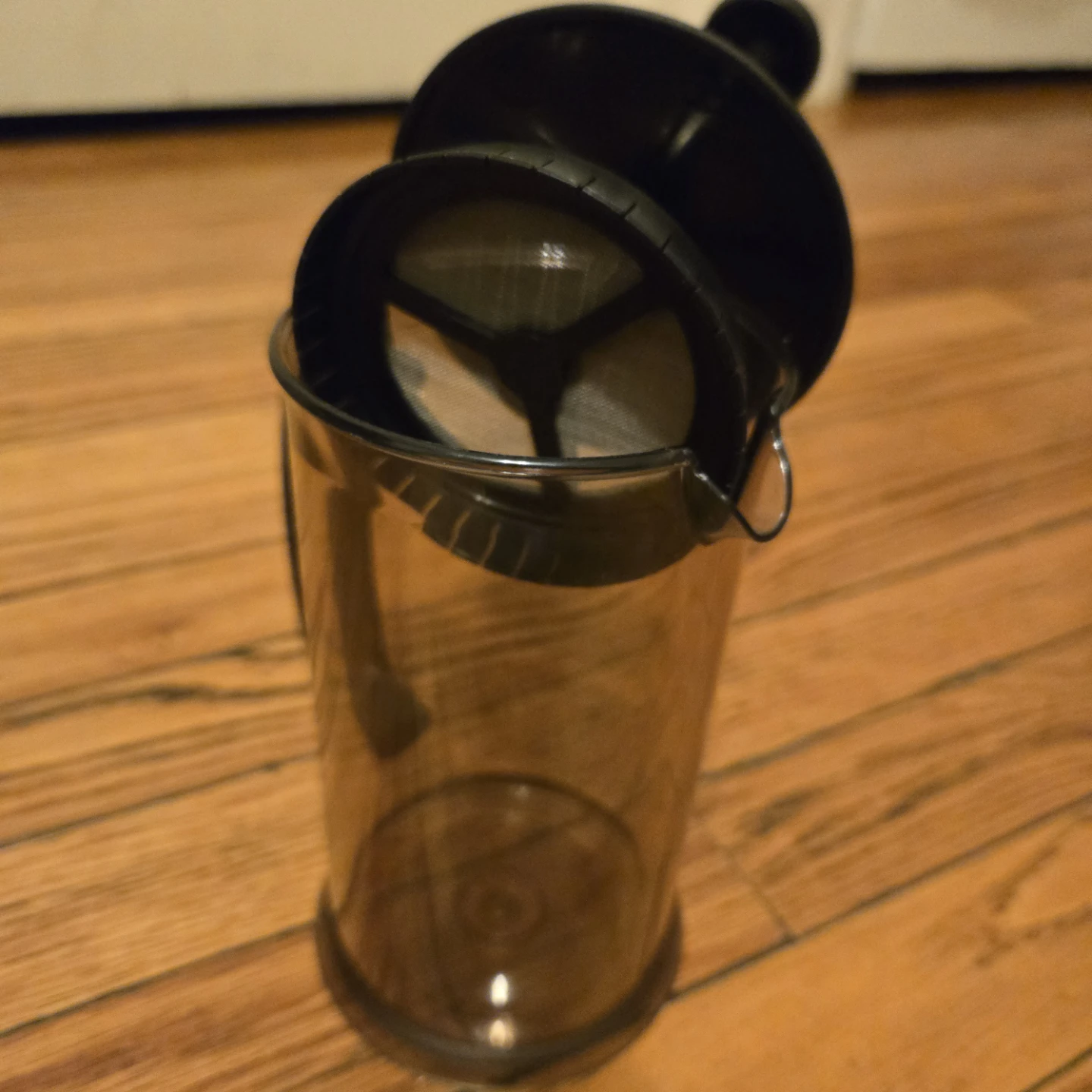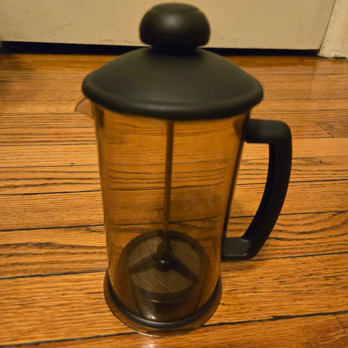 This is a plastic French press coffee maker. It has a capacity suitable for making multiple cups of coffee. Its design makes brewing fresh coffee simple for anyone.